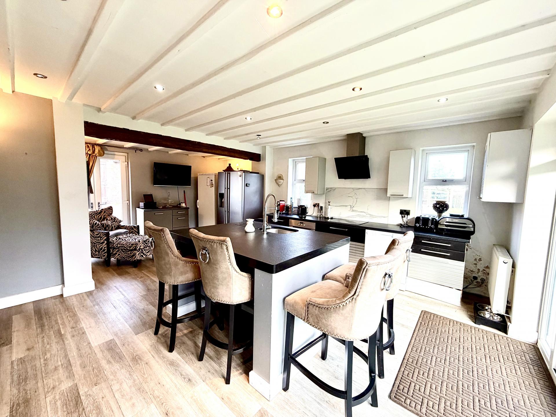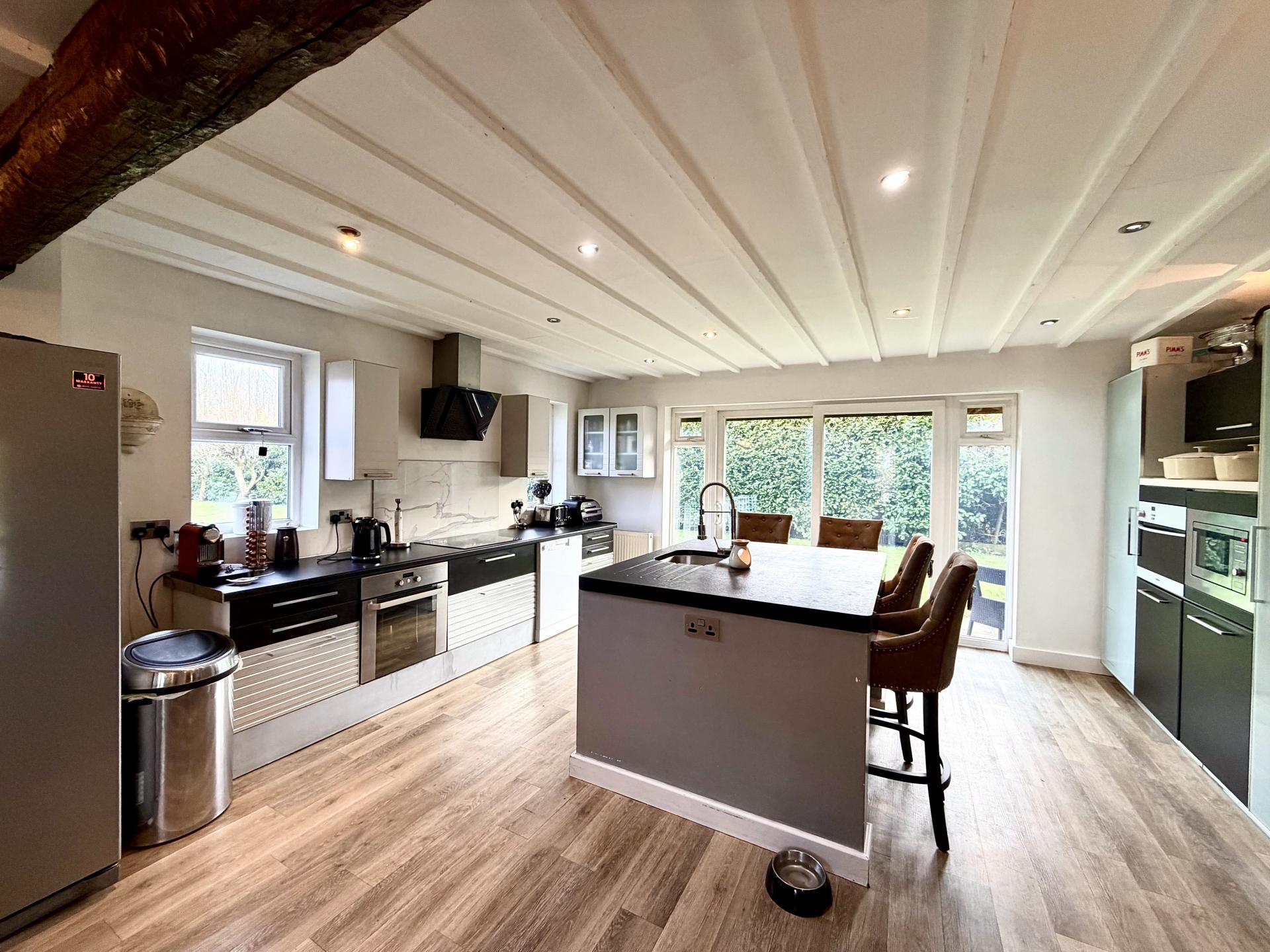 The ground floor is arranged to provide excellent separation of living spaces, comprising a well-appointed separate kitchen, a formal dining room and an inviting living room, all generously proportioned and benefiting from natural light and delightful views across the gardens and countryside beyond. These spaces are ideal for both relaxed family living and entertaining.