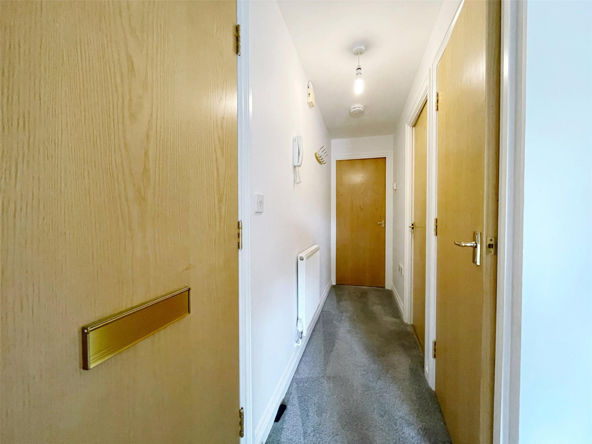 The property is accessed via a secure communal entrance with stairs rising to all floors. A private entrance door leads into the flats hallway, providing access to all rooms. The hallway also benefits from a built-in cupboard housing the gas boiler and offering useful additional storage.