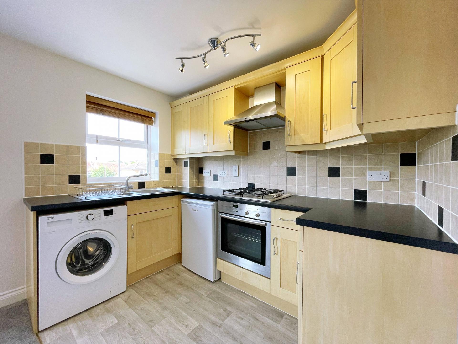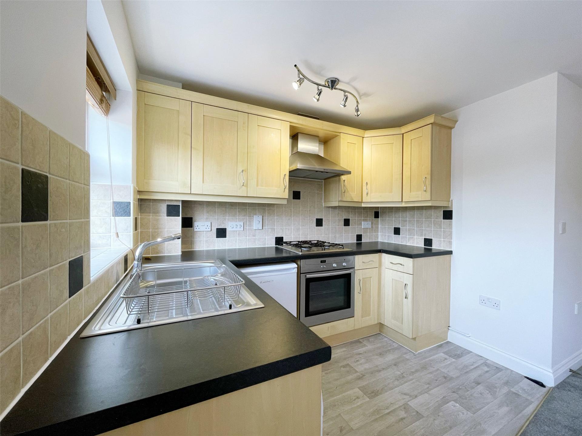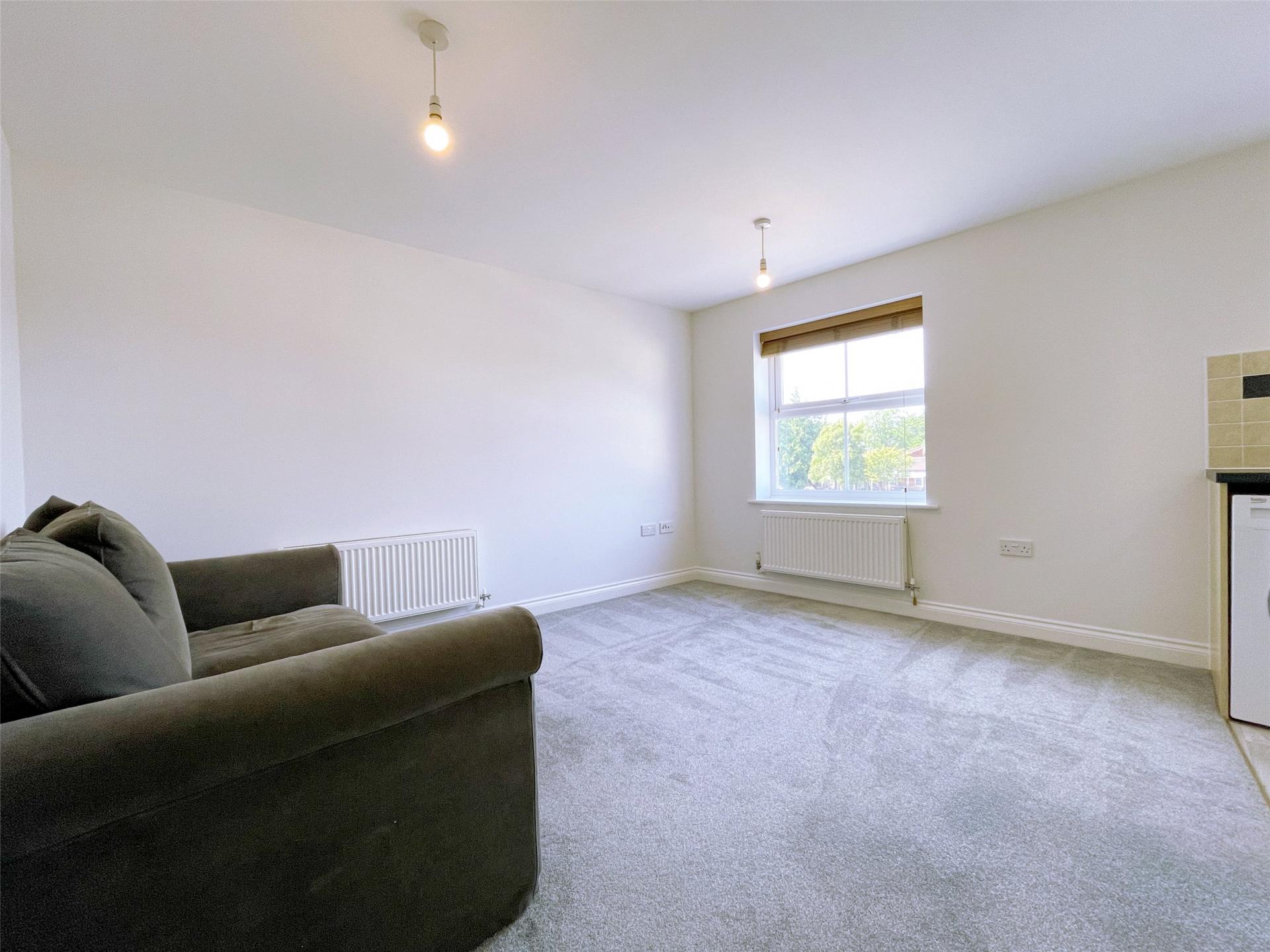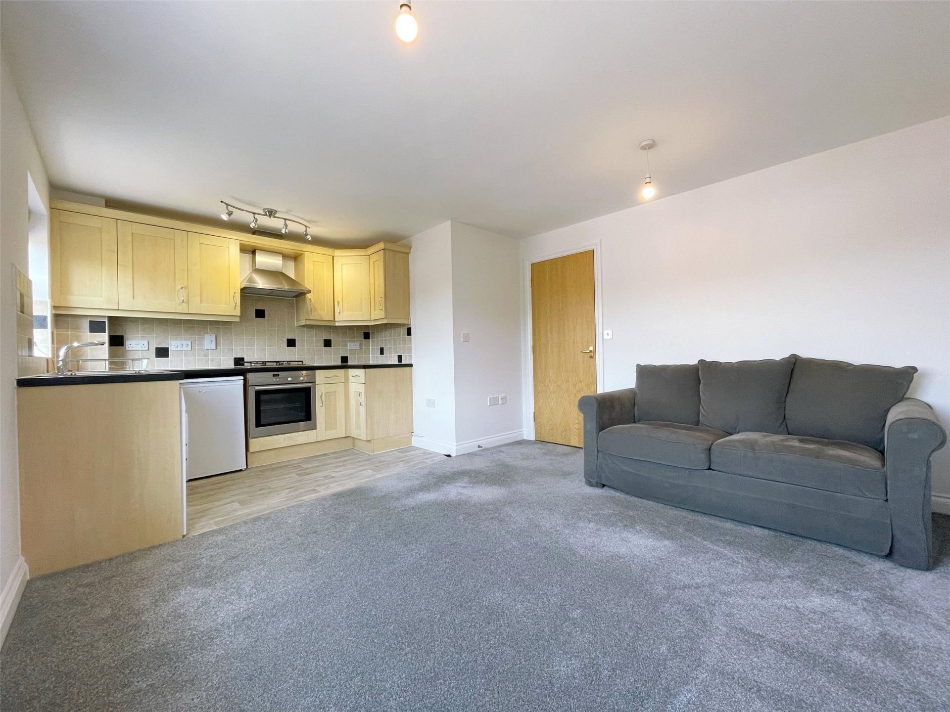 The accommodation comprises a bright open-plan sitting room and kitchen. The modern fitted kitchen includes a built-in electric oven and hob, while the sitting room area is spacious and neutrally decorated.