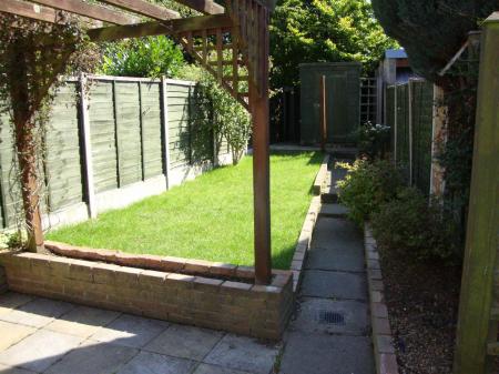 Rear Garden - Patio area with pergola over, lawn, flower beds, shed, outside water tap.