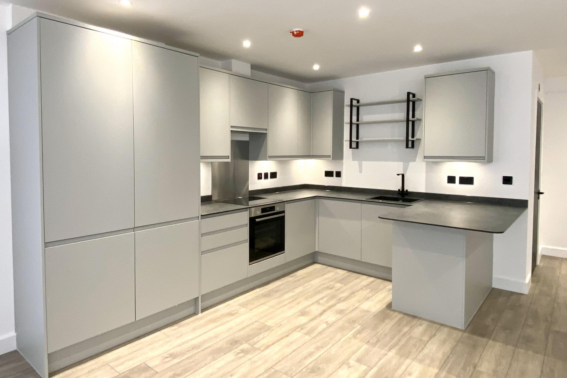 Number 8 is a ground floor studio which bursts with style and sophistication boasting grey luxury laminate flooring with underfloor heating throughout. The properties have individually designed contemporary kitchens. Matching wall and base units with two-toned doors with separate shelving units, integrated Bosch appliances including cooker, induction hob, fridge with freezer compartment and washer/dryer. Finishing the studio is a beautiful shower room with rainfall shower and luxury sanitary-ware.