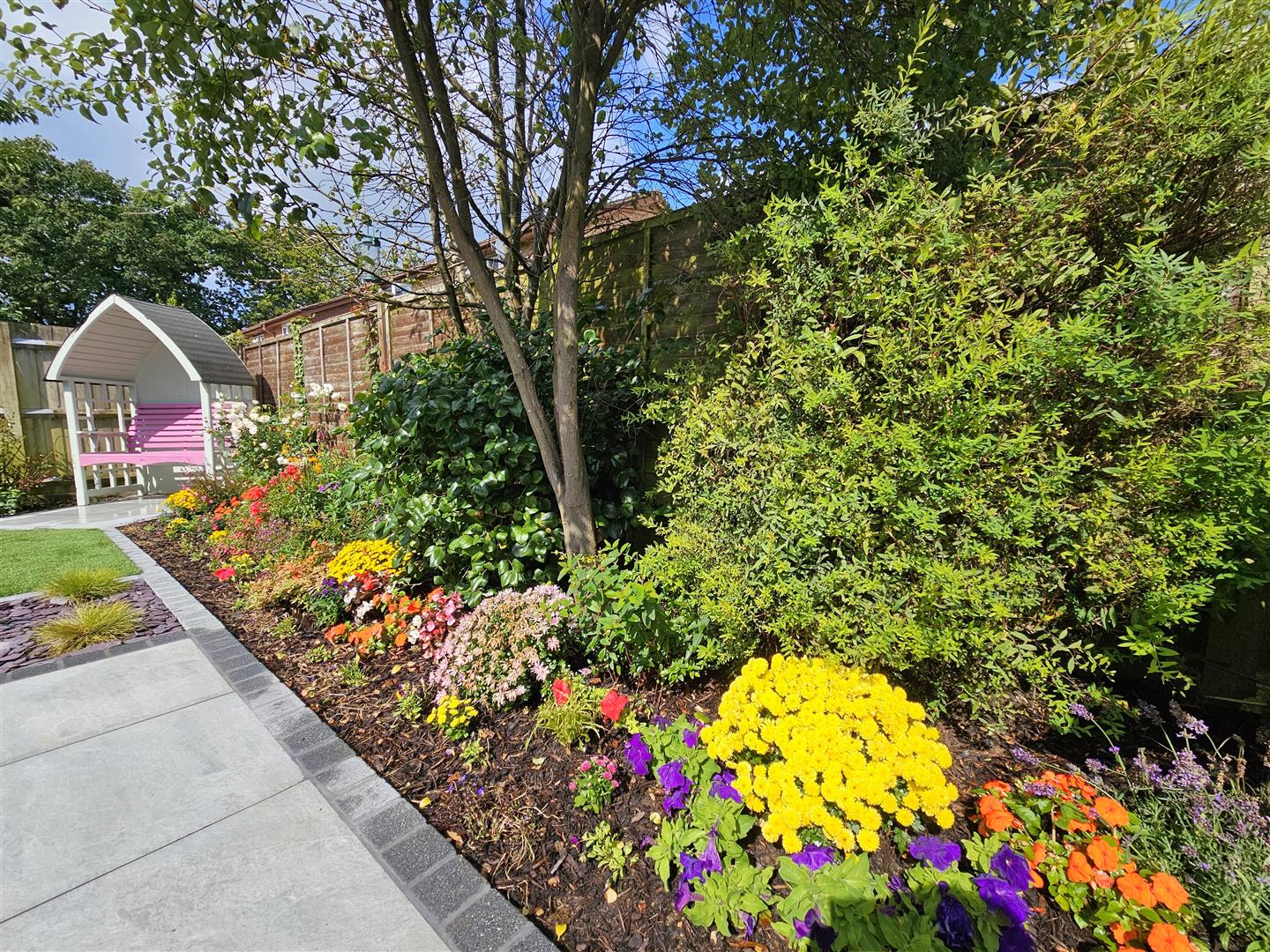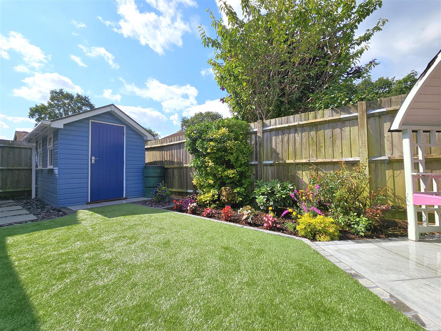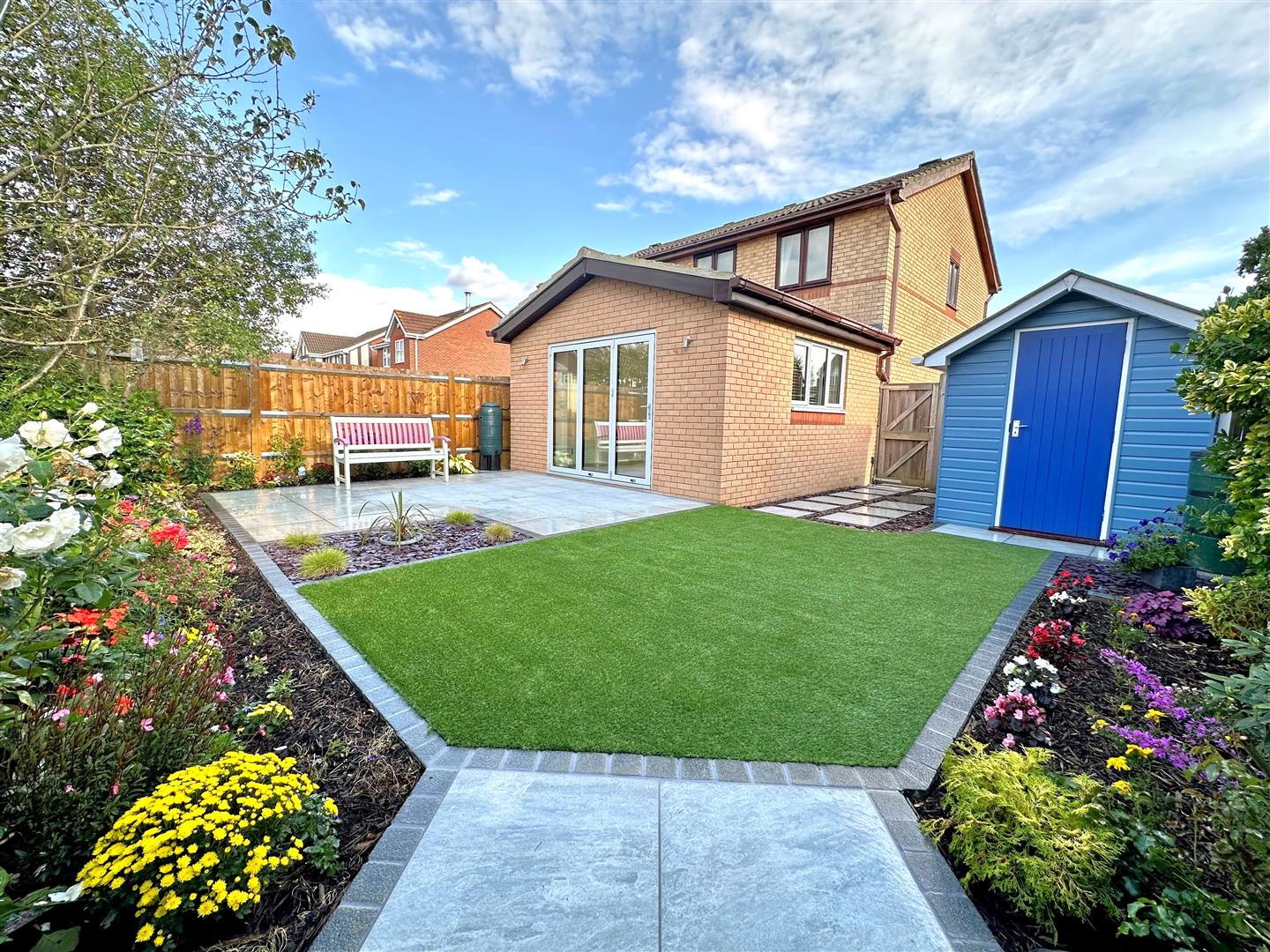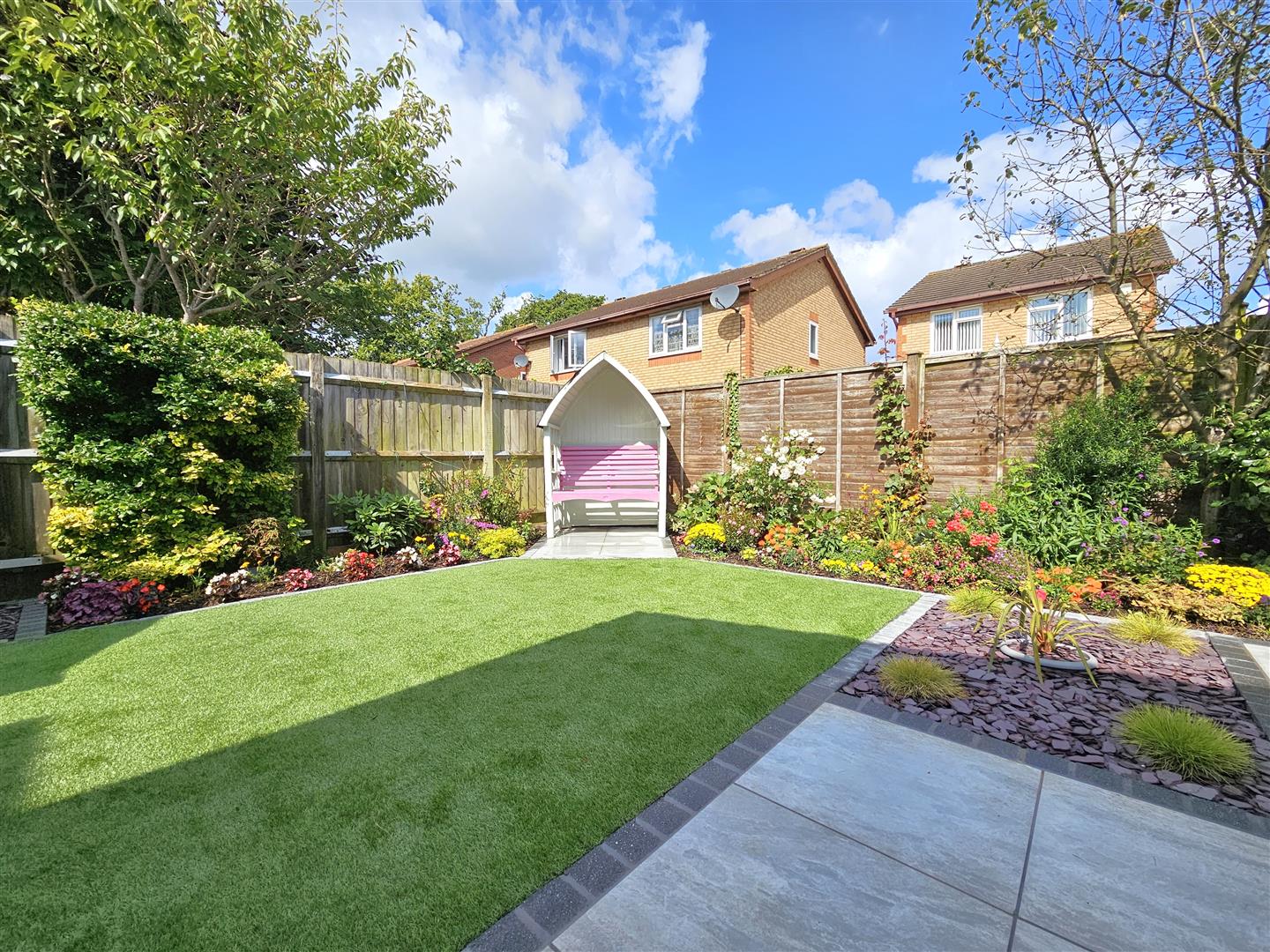 Beautifully landscaped rear garden majority laid to a high quality Porcelain paved patio with area laid to artificial lawn, display flower/shrubbery beds & side access