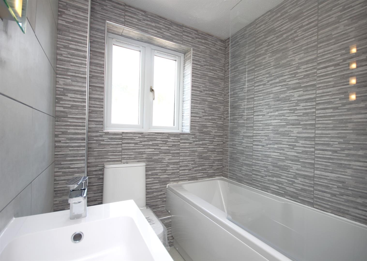Modern brand new family bathroom comprising three piece white suite, 'L' shaped shower/bath & attractive floor to ceiling tiling