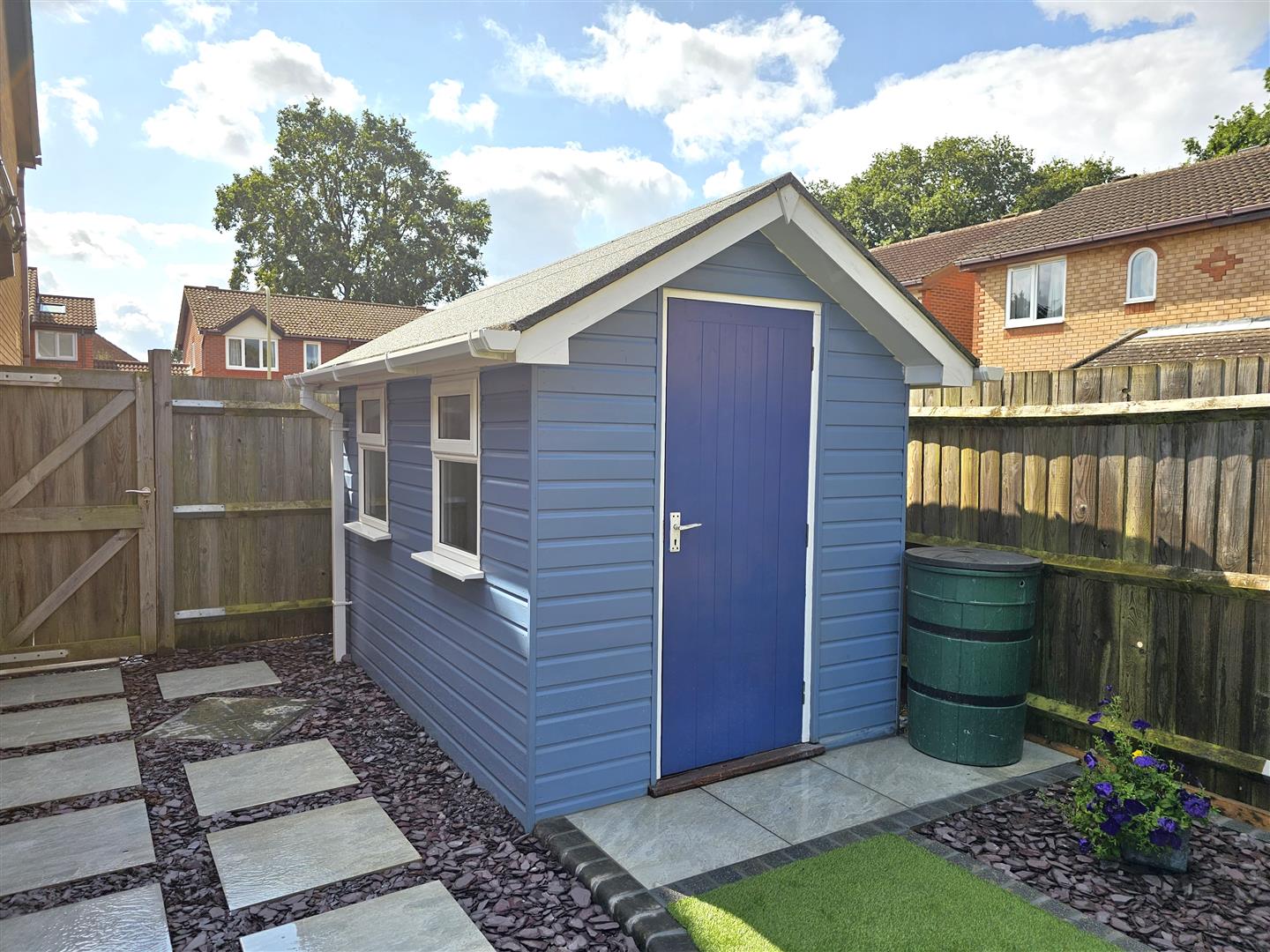 Fully insulated shed/home office enjoying carpet flooring, power, lighting & double glazing