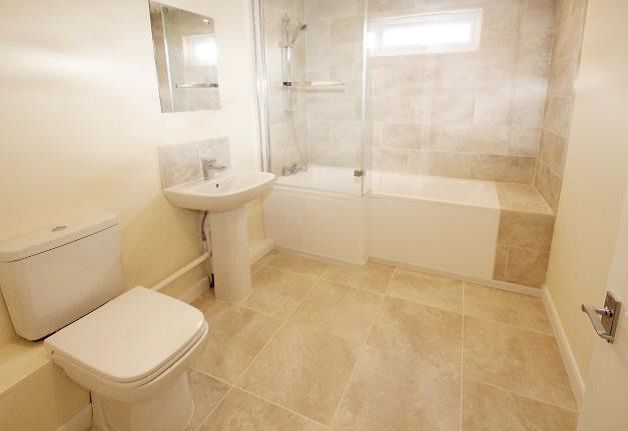 Double glazed frosted window to side, P-shaped panelled bath with mixer taps and shower over, low level w/c, pedestal hand wash basin, inset spot lights, ceramic wall tiling, tiled flooring and heated towel rail.