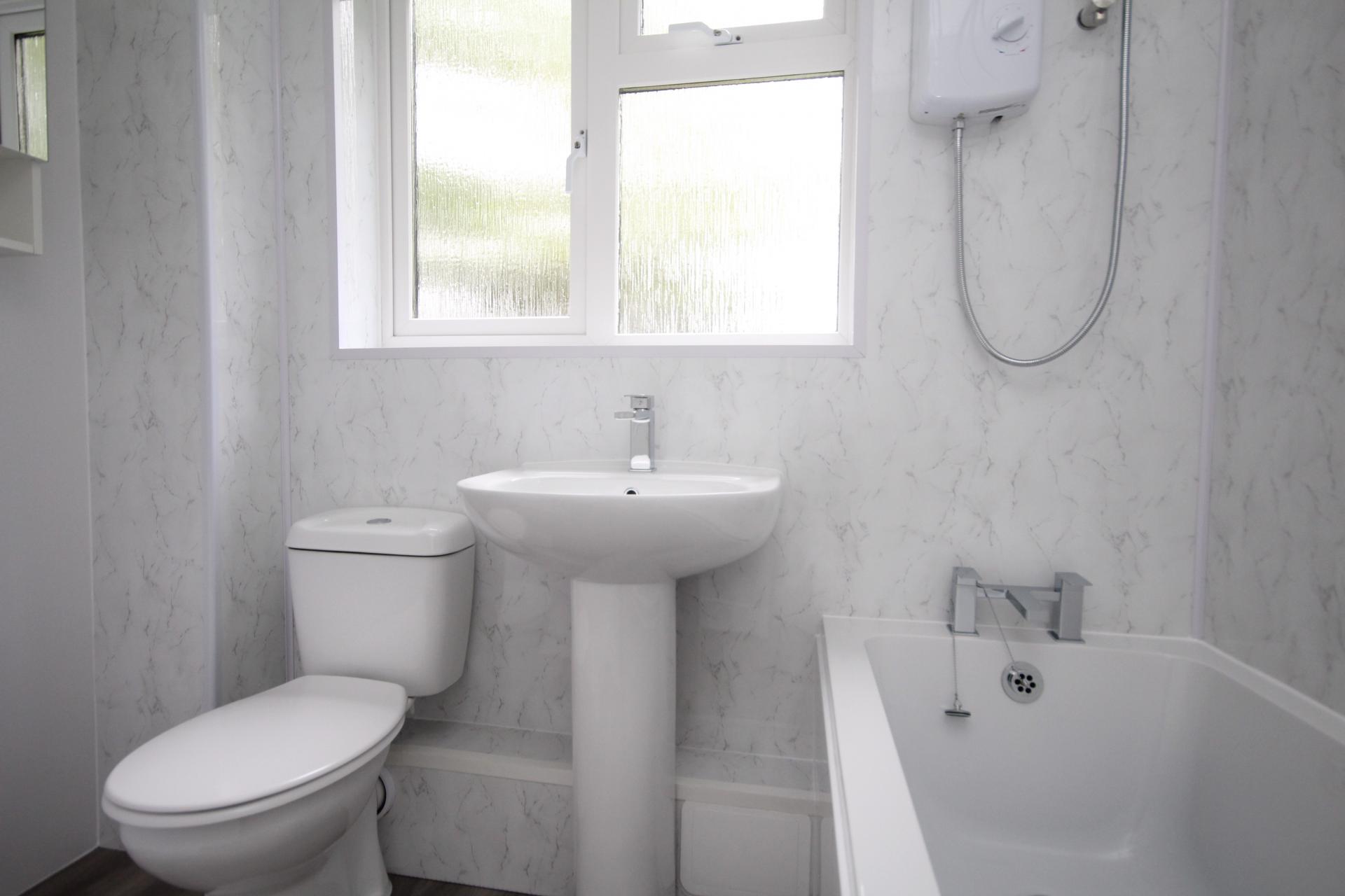 Double glazed frosted window to rear, panelled bath with mixer taps and electric shower over, pedestal hand wash basin, low level w/c, fitted vanity unit and airing cupboard.