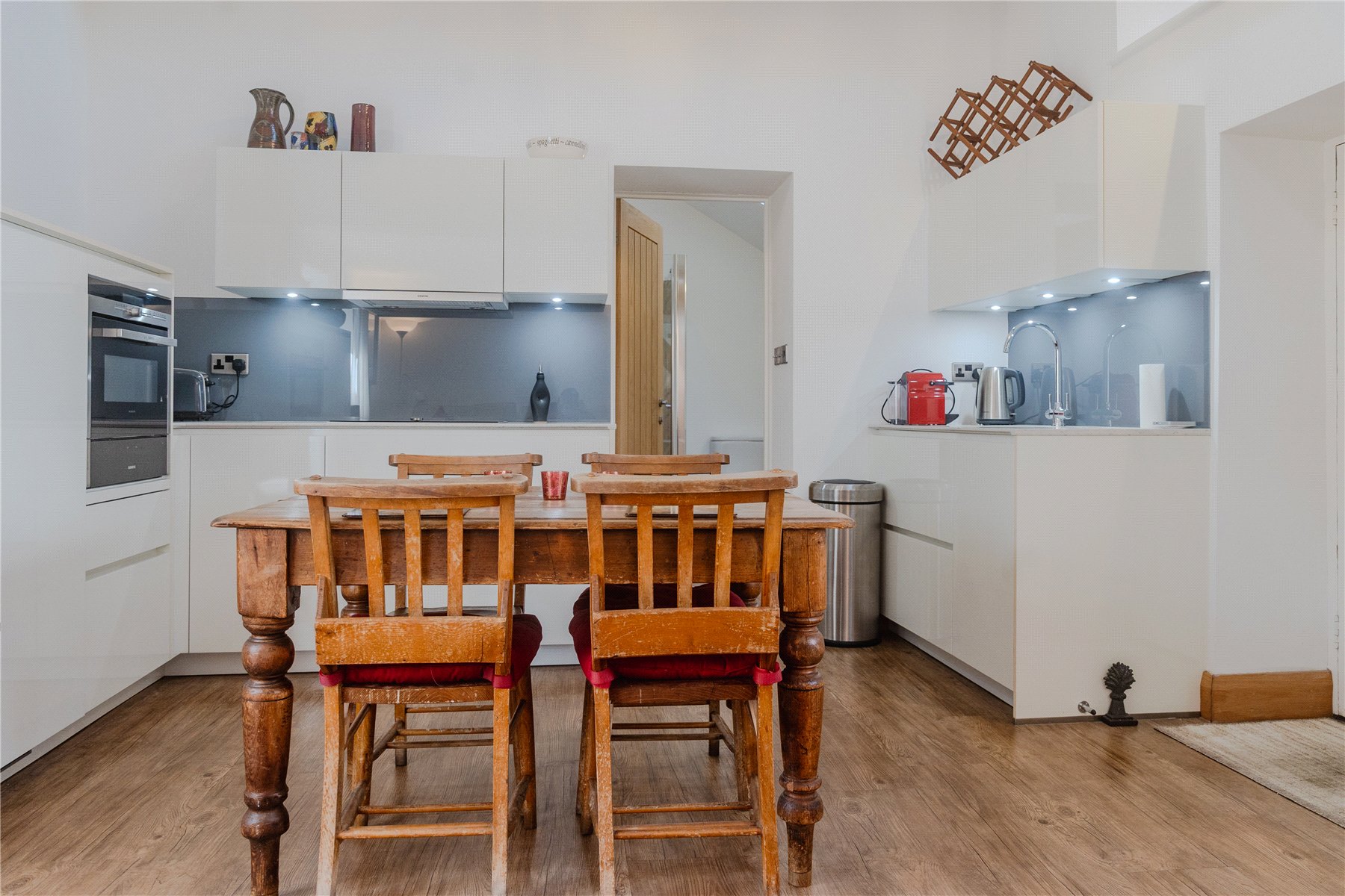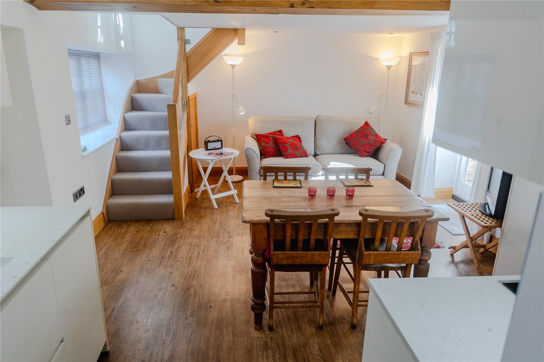 OPEN PLAN LIVING SPACE 12'2" x 16'5" (3.7m x 5m). A modern space with exposed beams, double glazed Velux windows with control to open. White gloss, soft close wall and floor mounted cupboards. Grey toned gloss splash backs. Integrated dishwasher, oven come microwave with heating drawn. Four ring induction hob with extractor fan above. Table with four chairs and sofa. Cupboard under the stairs and glass balustrade leading up to-
