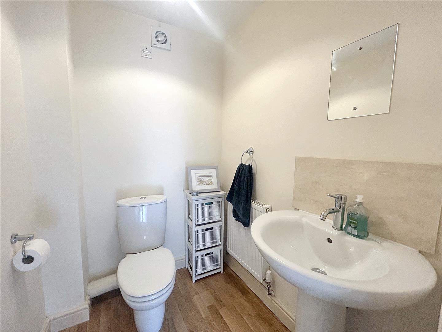 Cloakroom: - White suite low level WC, pedestal wash hand basin, travertine tiled floor, extractor fan.