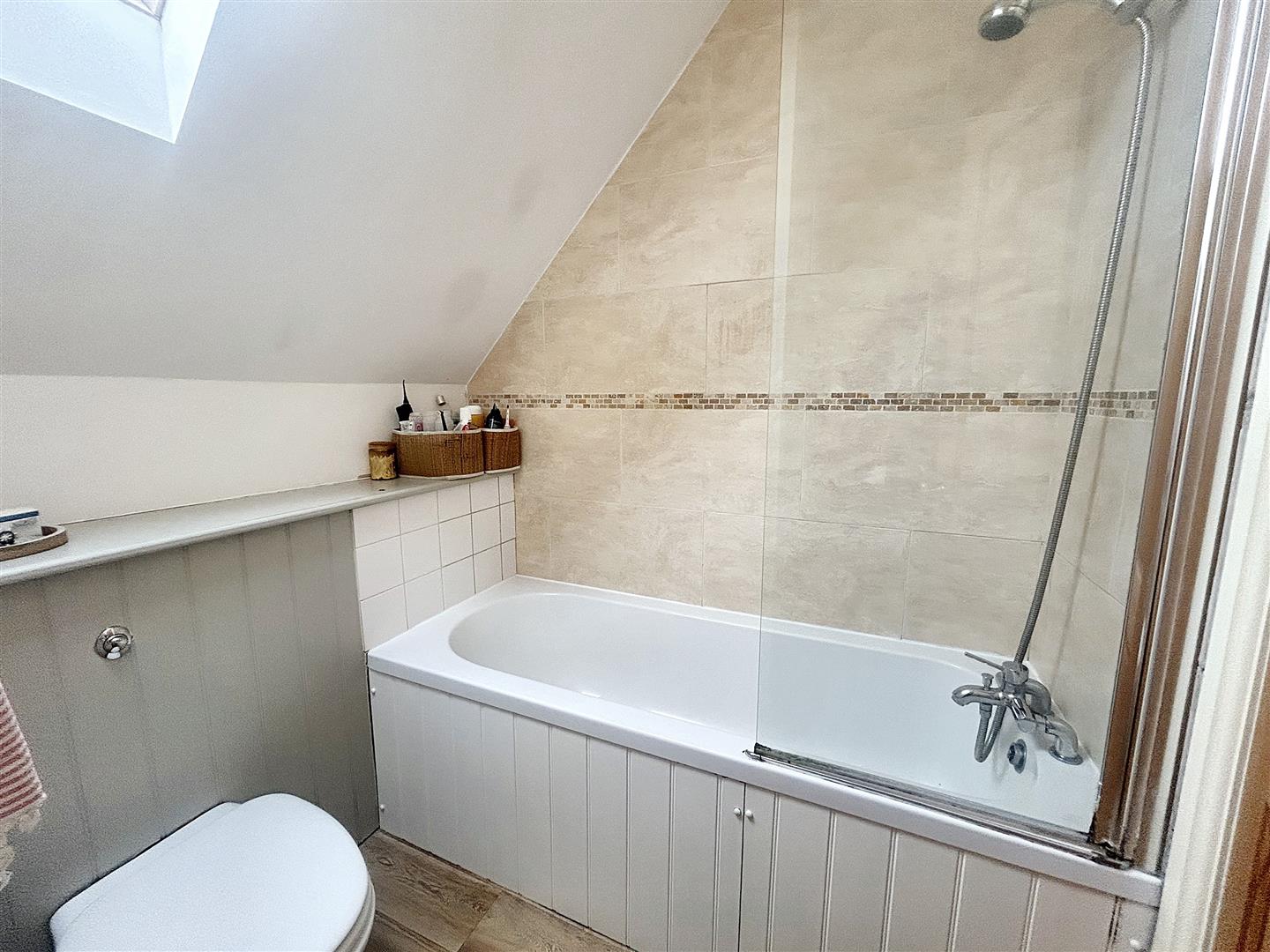 Bathroom: - 2.01m x 1.63m - White suite of panelled bath with mixer tap shower and side screen, pedestal wash hand basin, low level WC, pitched ceiling, single radiator, Velux window, extractor fan.