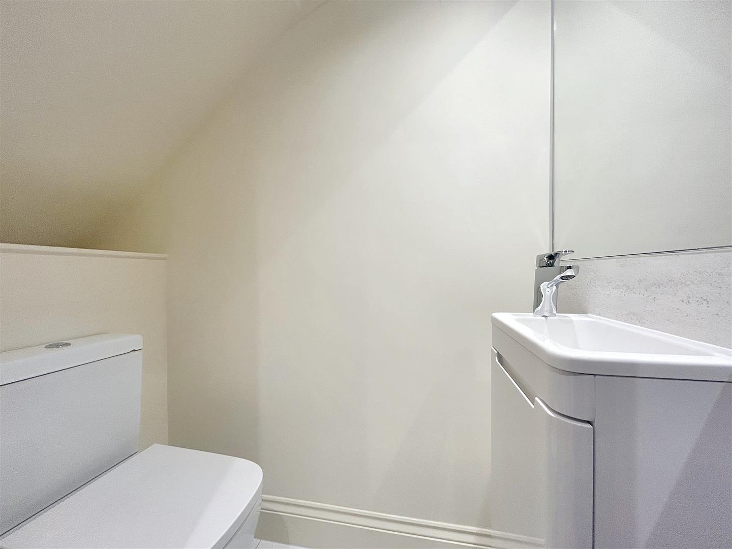 W.C - Fitted in a white, two piece suite, comprising a sink unit with drawer underneath, a W.C and a mirror.