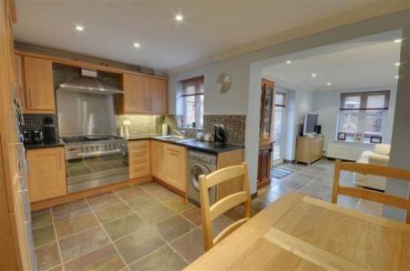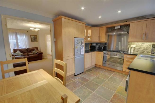 Kitchen/Breakfast Room: - 2.895m x 4.406m - UPVC window to the side. Fitted with a range of wall and floor units incorporating a range cooker and space for appliances. To one side is a breakfast bar with shelving above. Radiator. Ceramic tiled flooring.
