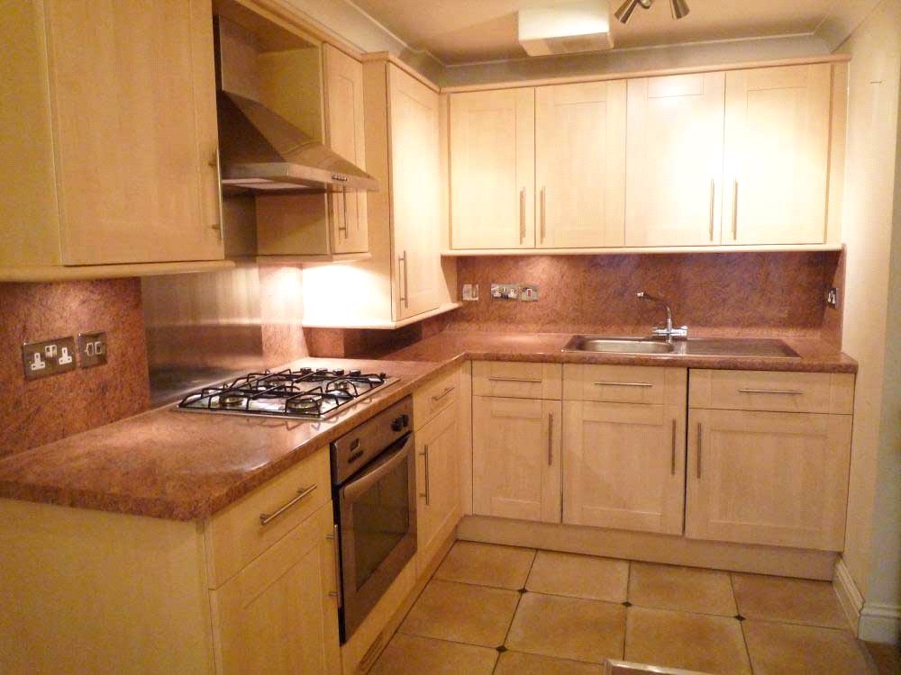 Kitchen Range of wall and base units with work surfaces over and spot lights under. Integrated cooker, washing machine and fridge. Built-in oven and hob with filter hood over. Sink and drainer unit with mixer tap. Tiled flooring.