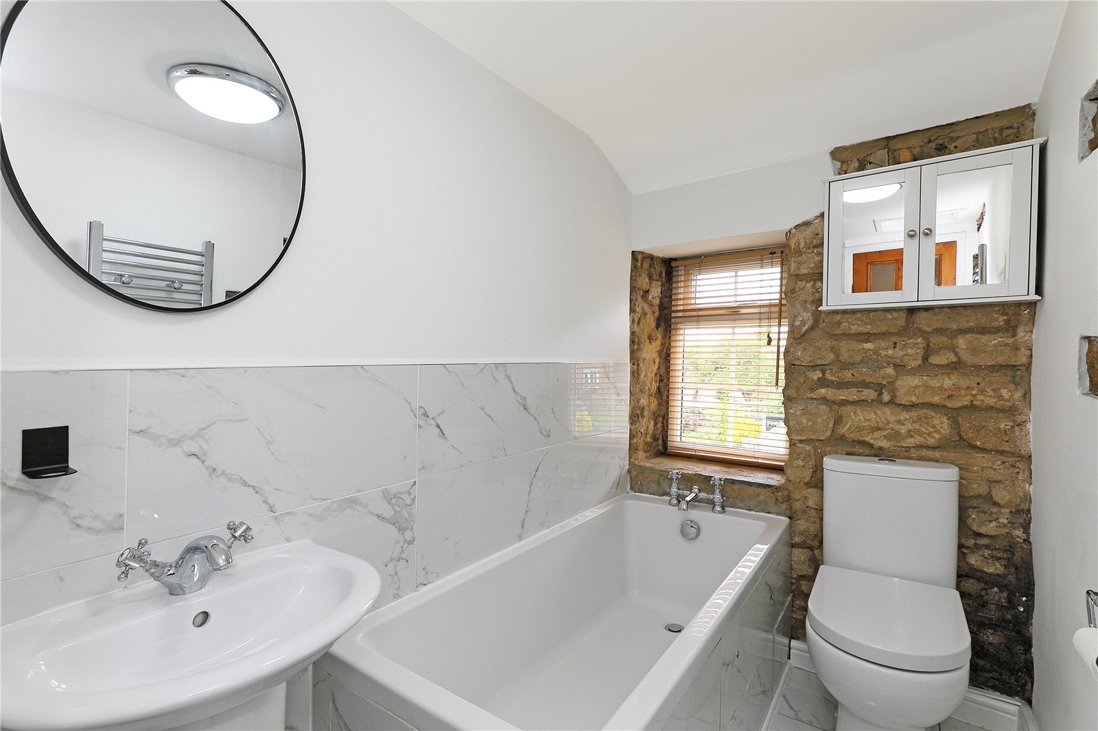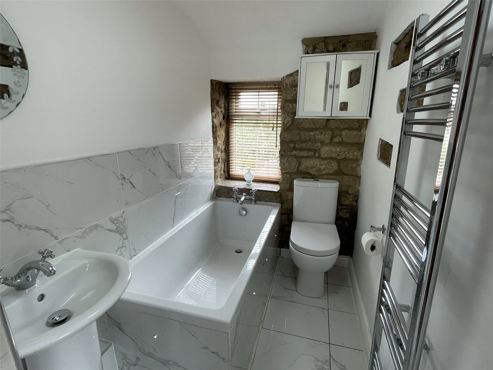 Combined Bathroom Furnished with white suite, comprising, pedestal wash basin, low flush wc, panelled bath, separate shower cubicle with electric shower, tiling and tiled to the floor, exposed stone work, two double glazed windows, central heating radiator.