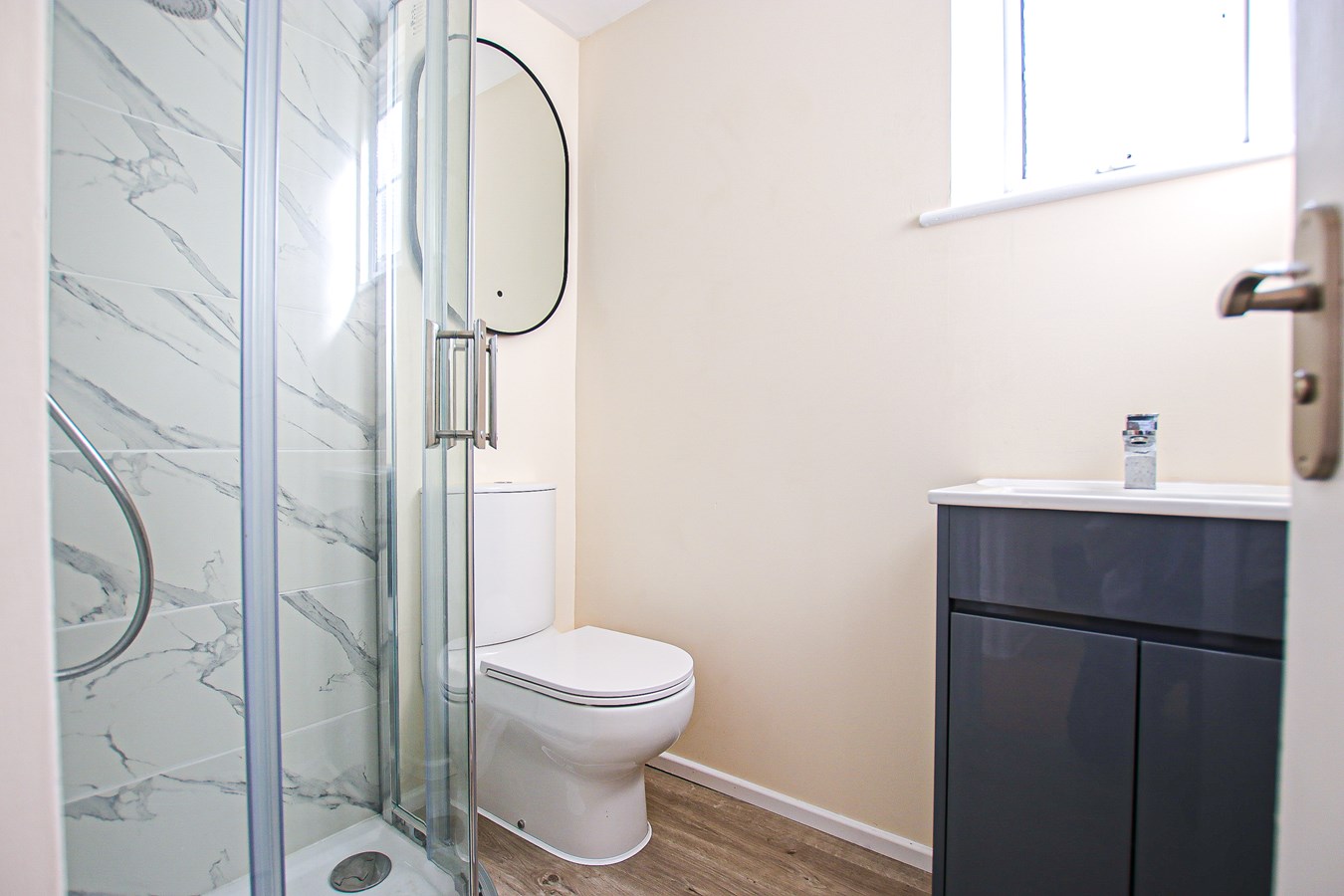 5' 8" x 4' 11" (1.73m x 1.50m) Fully enclosed shower cubicle with thermostatically controlled shower, wash hand basin with mixer tap and cupboard under, close coupled W.C., electric heated towel rail, side aspect double glazed window.