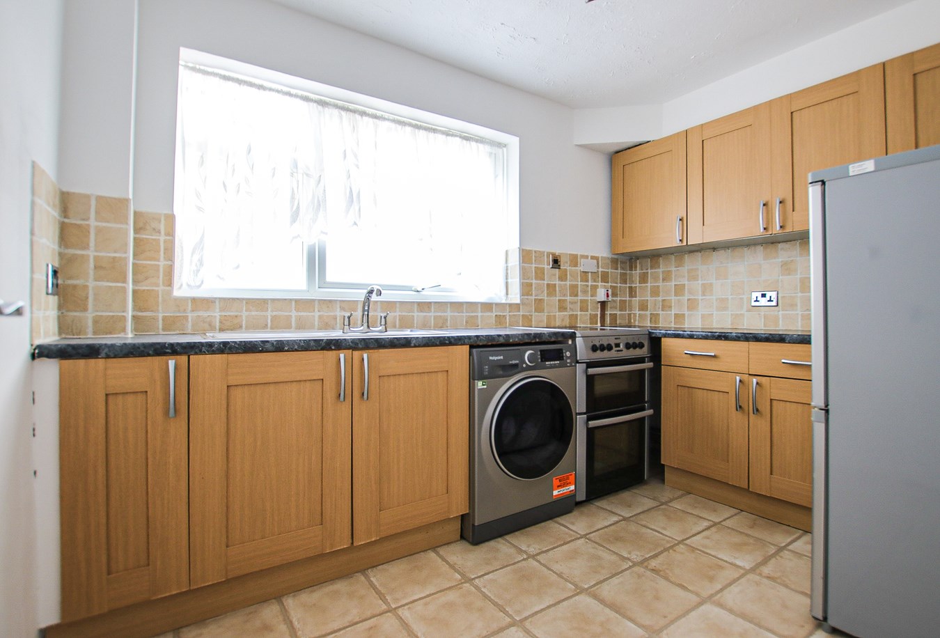 10' 5" x 7' 5" (3.17m x 2.26m) Matching wall and base units with work surfaces over, stainless steel single drainer single bowl sink unit with mixer tap, washing machine, electric hob with electric oven under, tall fridge freezer, part tiled walls, vinyl floor, side aspect double glazed window.