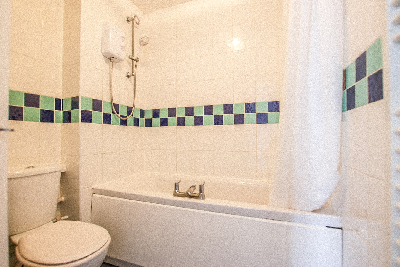 6' 9" x 6' 2" (2.06m x 1.88m) Modern white bathroom suite comprising panel enclosed bath with mixer tap and Triton T80si electric shower unit over, pedestal wash hand basin with mixer tap, close coupled W.C., part tiled walls, vinyl floor, extractor fan, heated towel rail.