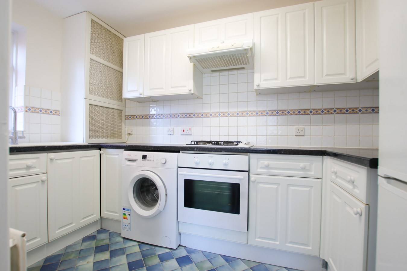 10' 7" x 6' (3.23m x 1.83m) Fully fitted kitchen with wall and base units and work surfaces over, gas hob with electric oven and air filter hood over, fridge freezer, washing machine, double glazed window to side.