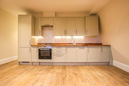 Open plan to kitchen. Matching wall and base units with work surfaces over, stainless steel single drainer single bowl sink unit with mixer tap, integrated washing machine, gas hob and electric oven under with air filter hood over, integrated fridge freezer, dishwasher.