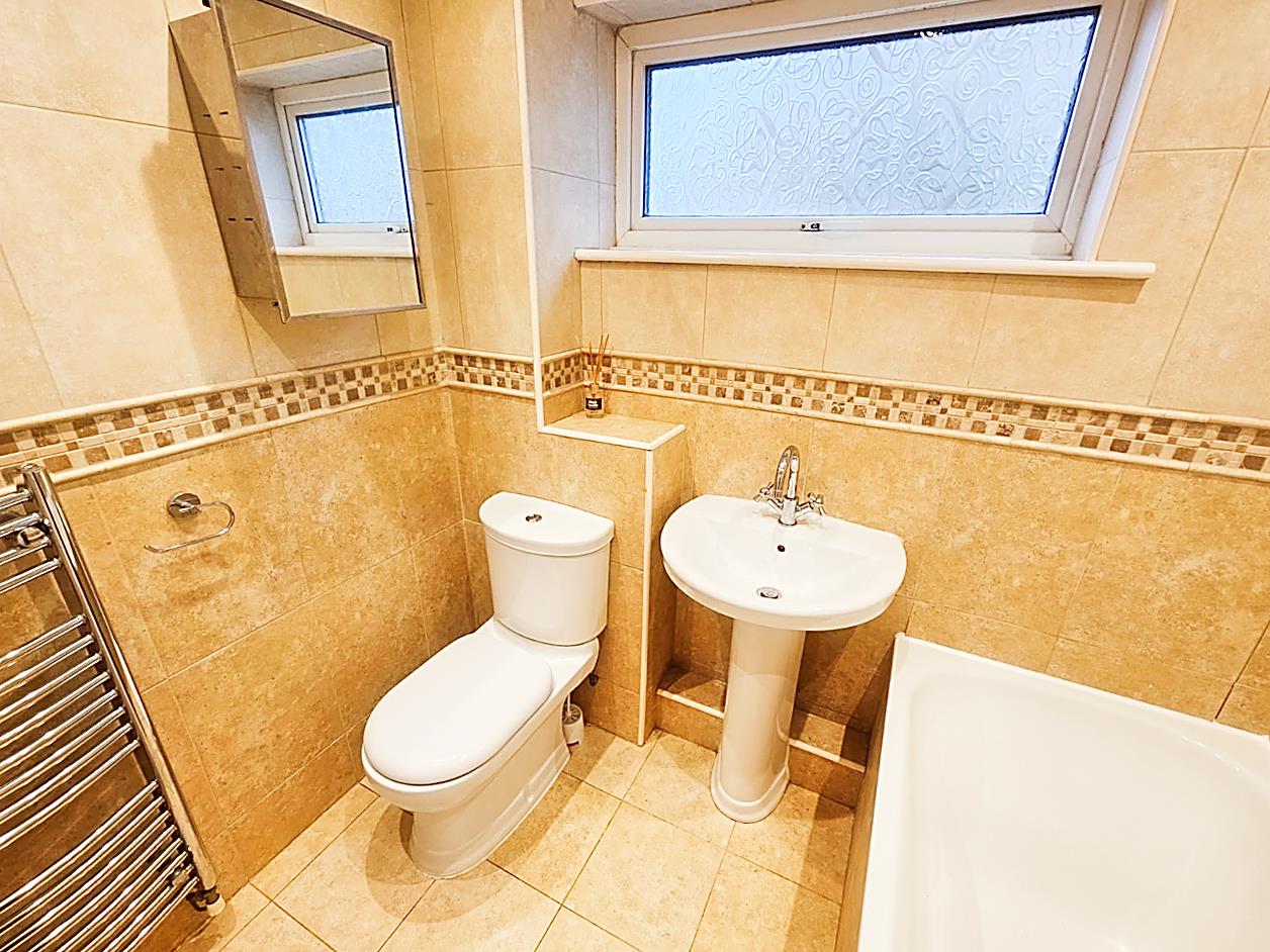 Bathroom - 2.09 x 1.65 - Comprising; bath with shower over, low level WC, wash hand basin. Tiling to walls and floor, ladder style radiator, double glazed window.