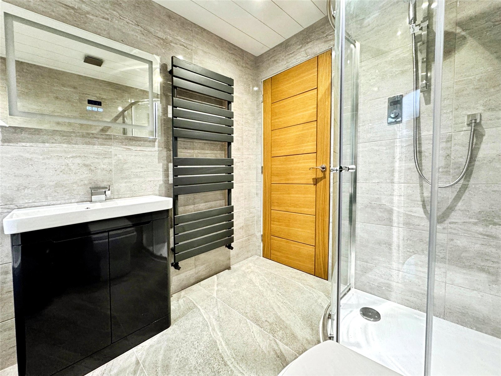 Double glazed window, wall mounted radiator, ceiling spotlights, access to loft via hatch.