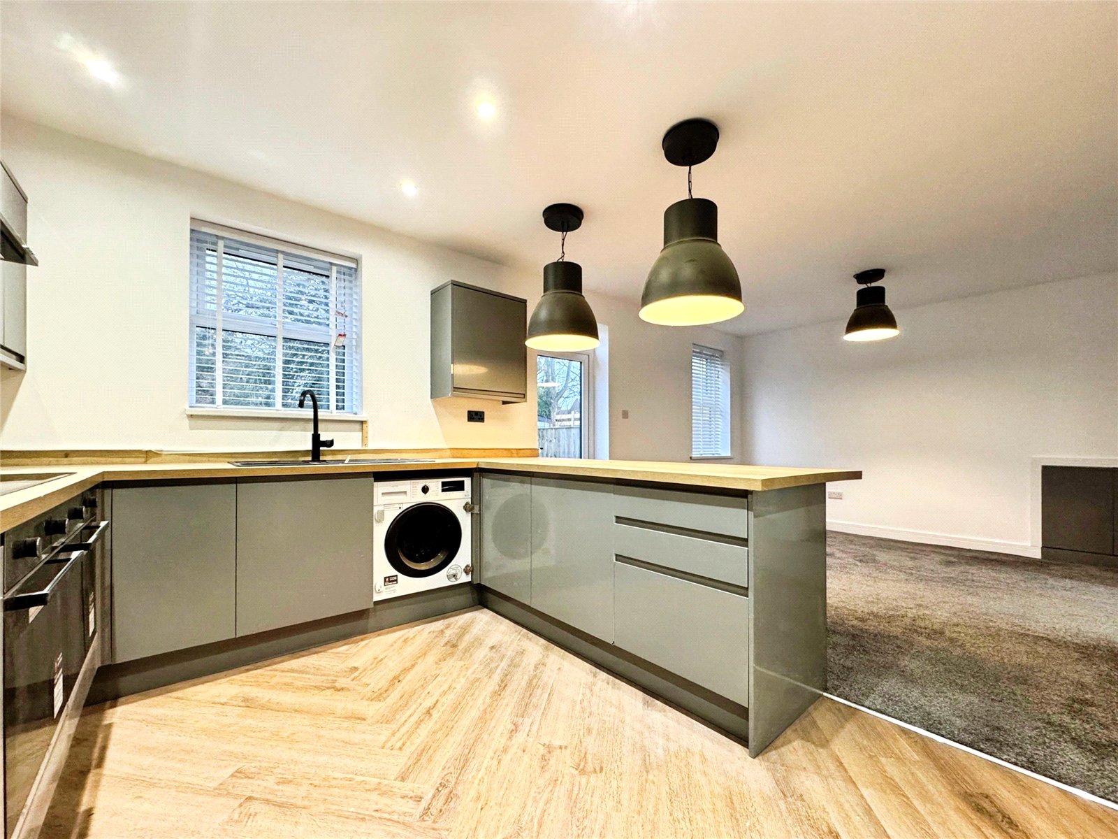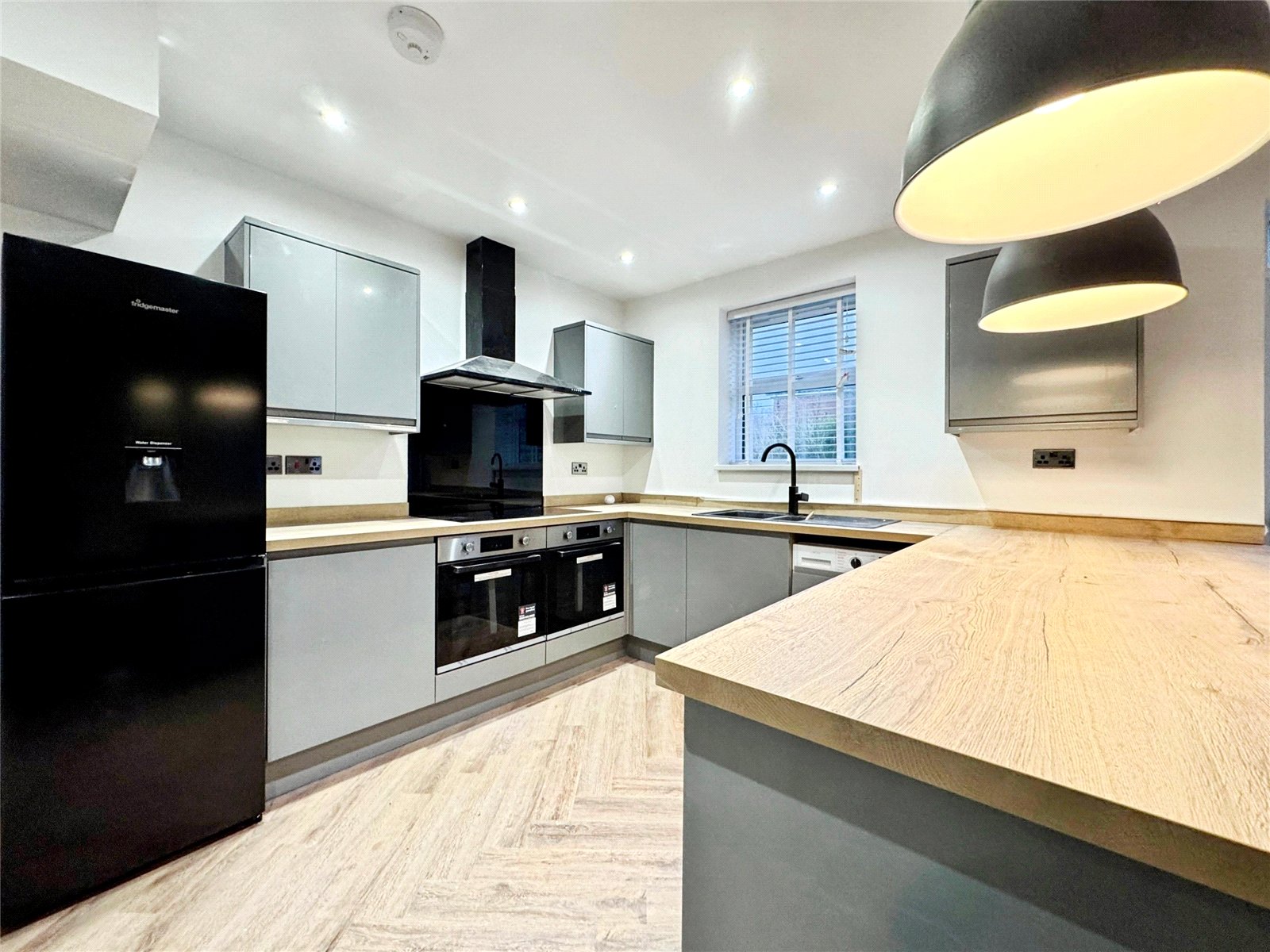 Range of wall and base units with wooden work top surfaces incorporating one and a half bowl sink unit with mixer tap, double electric oven and double induction hob with extractor fan over, integrated washing machine, integrated dishwasher, freestanding fridge/freezer, ceiling spotlights and cupboard housing boiler.