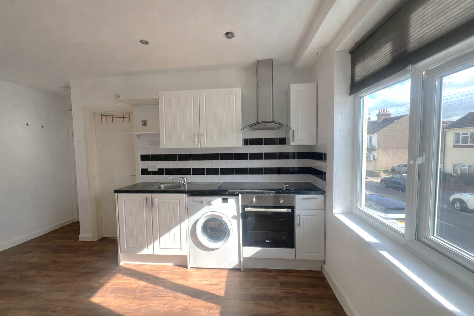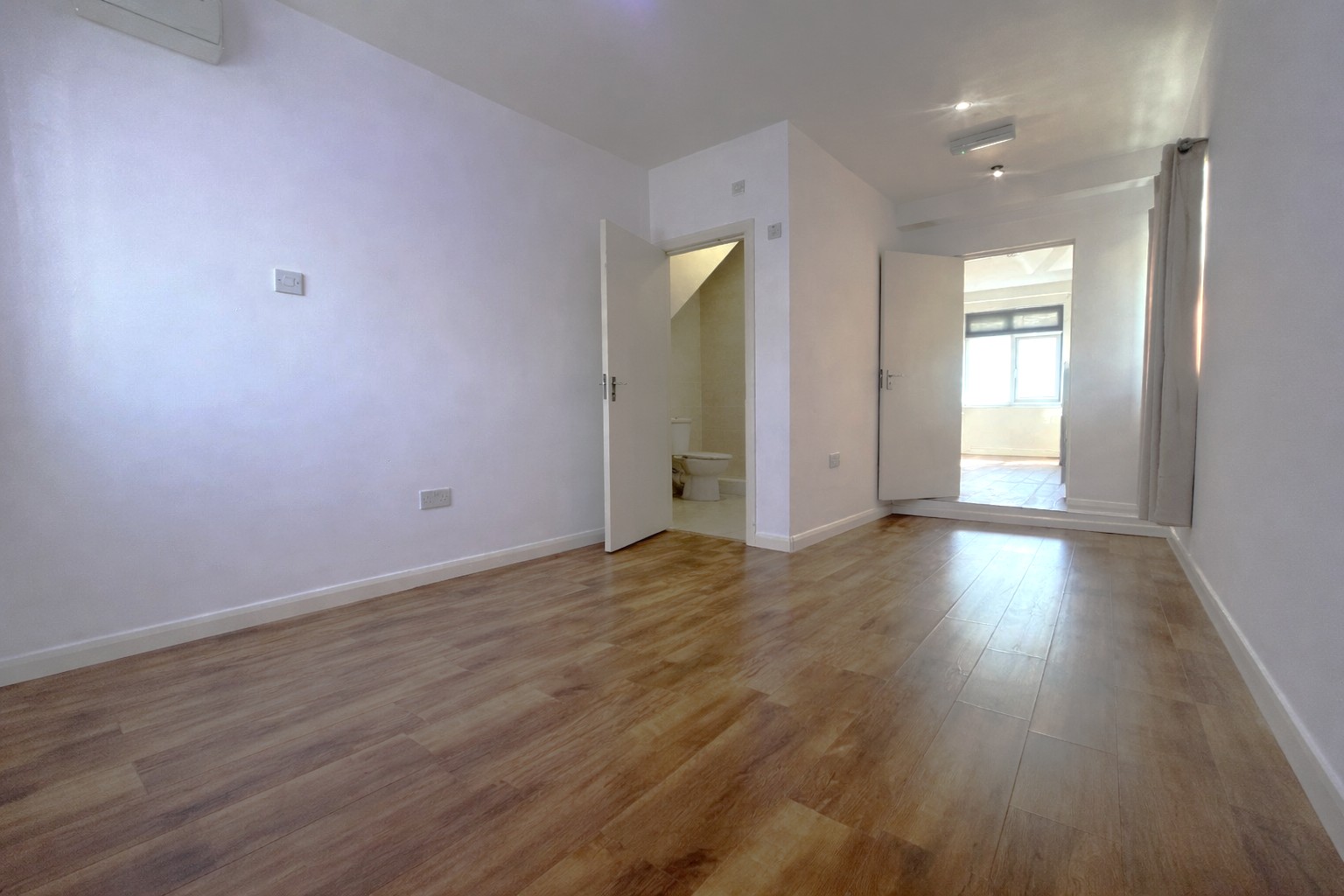 - Wood-effect laminate flooring throughout