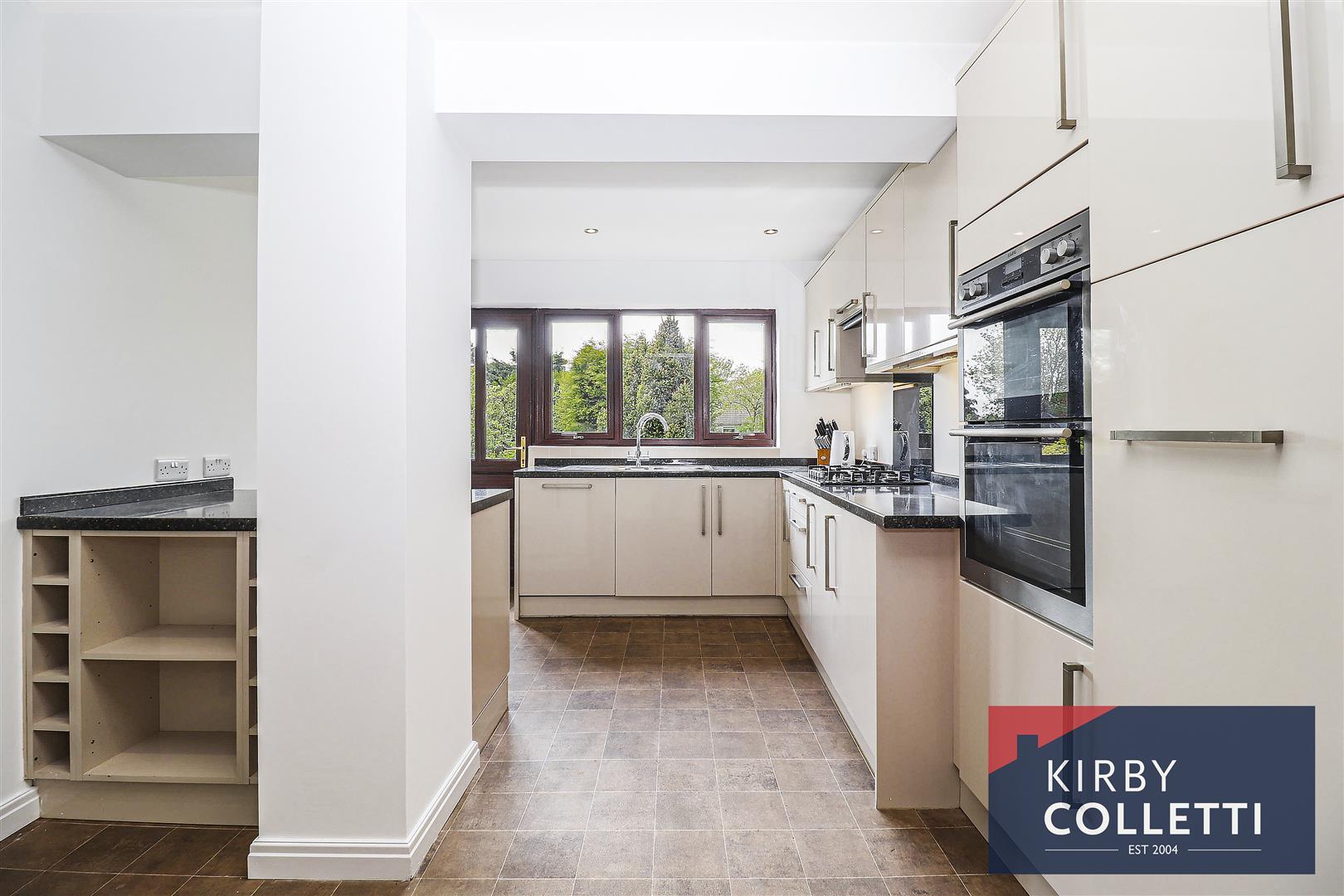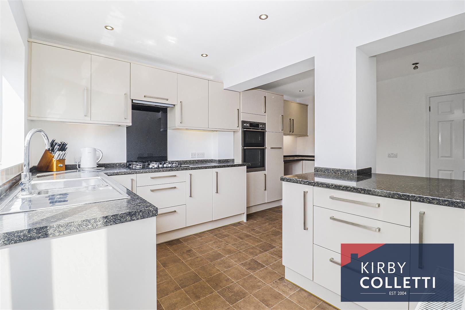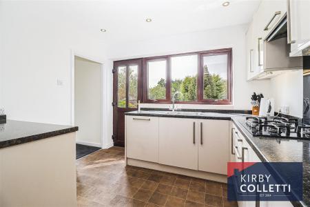 Kitchen - 5.00m'' x 3.05m.0.91m' (16'5'' x 10.3'' ) - Rear aspect uPVC double glazed window and uPVC double glazed door to rear garden. Range of wall and base mounted units. Roll edged worksurfaces. Inset single drainer one and half bowl stainless steel sink unit mixer tap over. Built in gas five ring hob. Extractor hood over. Built in 'AEG' oven. Integrated dishwasher. Plumbing for washing machine. Space for fridge/freezer. Large understairs storage cupboard. Radiator. Recessed spotlights.