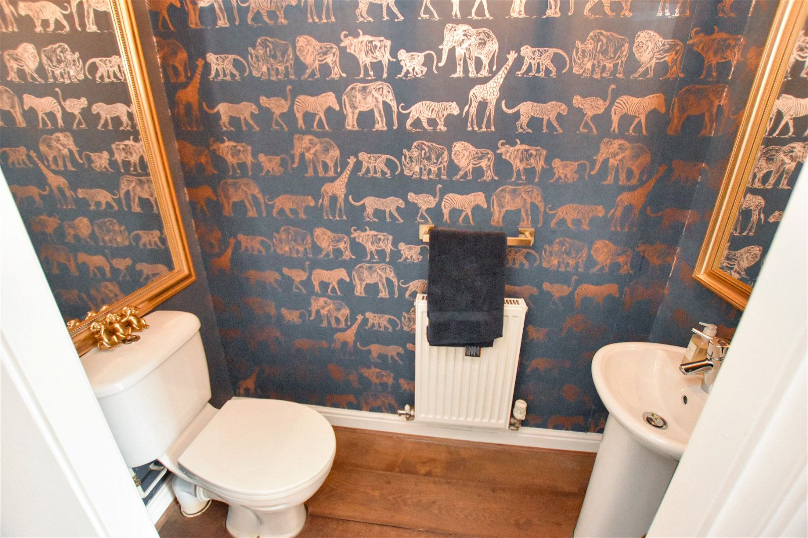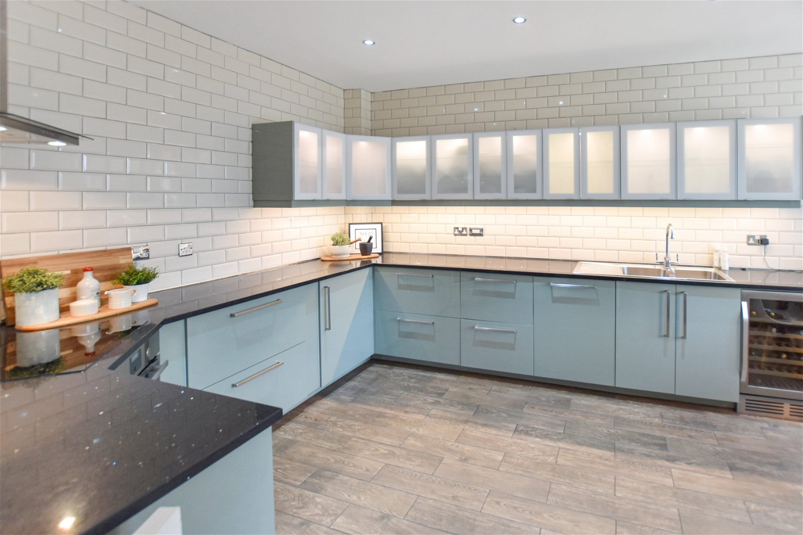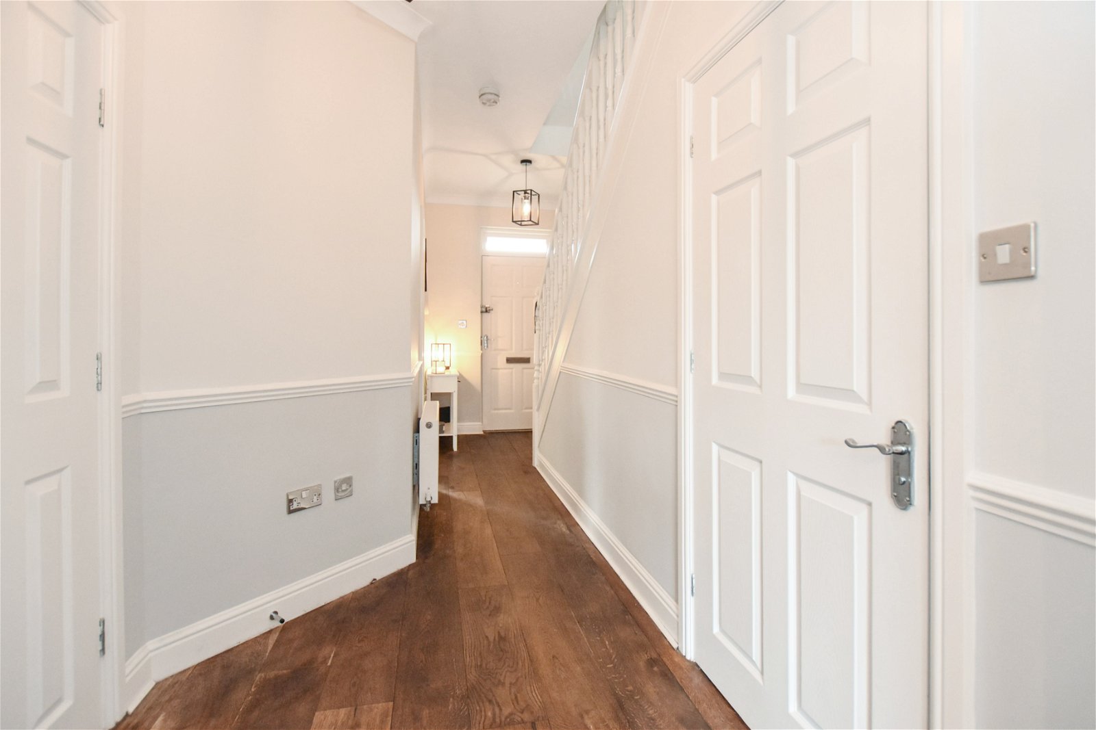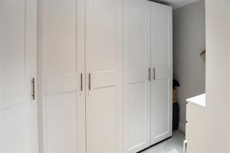 Upon entry, you are welcomed by an inviting entrance hall, complete with a convenient downstairs WC and cloakroom. The ground floor further benefits from a practical utility area and leads into a high-specification, high-gloss kitchen diner, perfect for both everyday family meals and entertaining. Adjacent to this, a panelled lounge provides a relaxing space with direct access to a contemporary courtyard garden, seamlessly blending indoor and outdoor living.