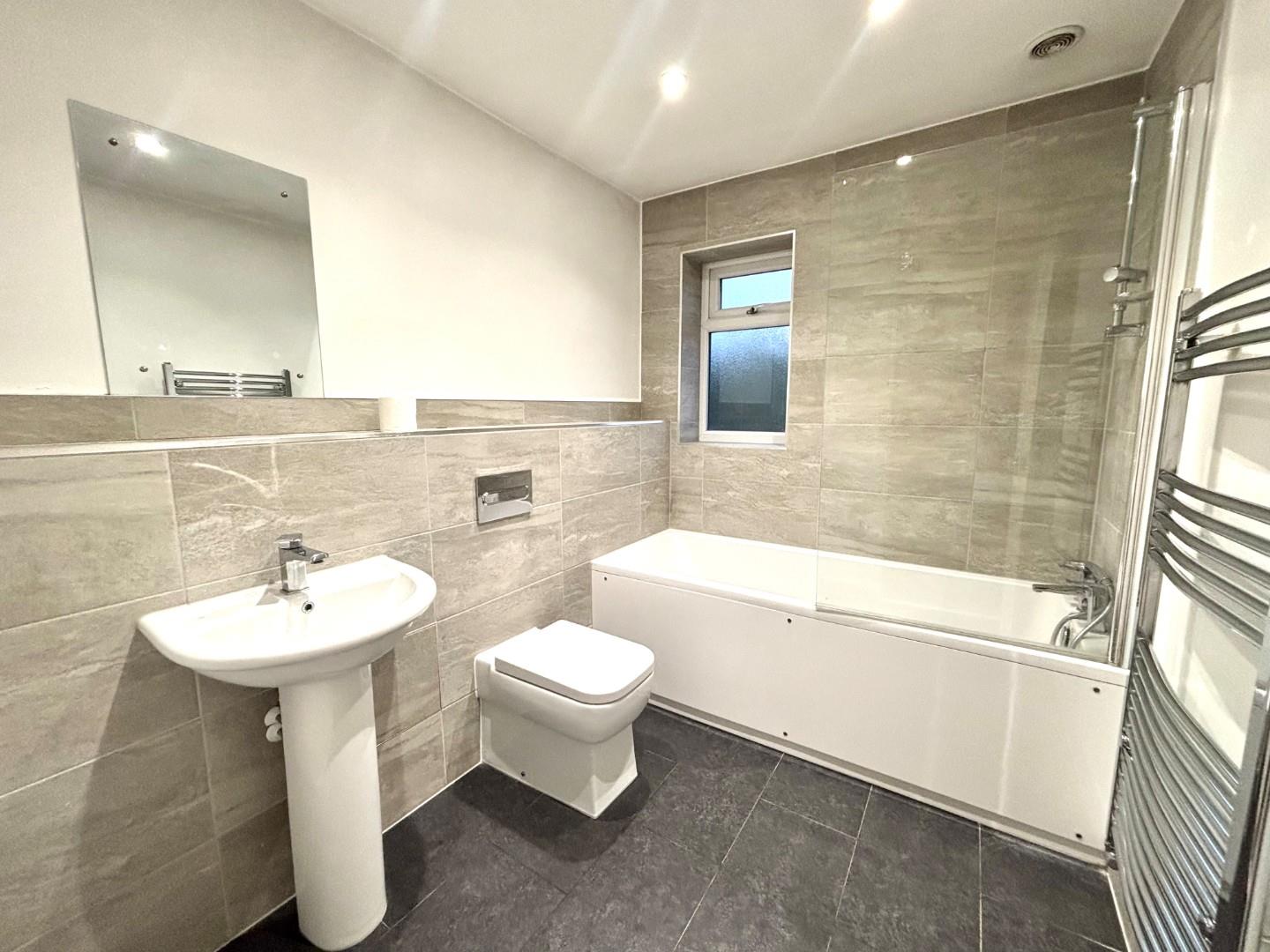 Bathroom - 2.51m x 2.01m (8'3" x 6'7") - Vinyl flooring, panel bath with shower over, wash basin, toilet, tile splash-backs, built in storage, UPVC double glazed window to rear elevation