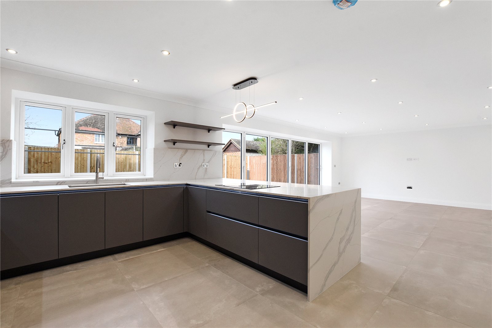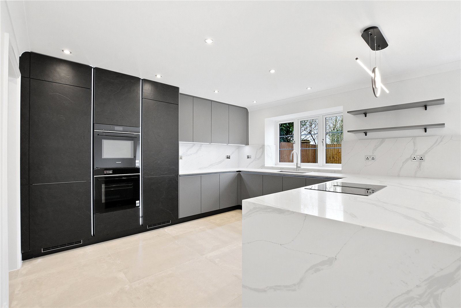The living space within Carillon House epitomizes contemporary living, featuring a generously proportioned open plan 32' Kitchen/Dining/Family room. The kitchen itself is a testament to luxury, boasting a 'Nolte' design with two-tone cabinetry, integrated Siemens appliances and elegant stone worktops. Bi-fold doors seamlessly connect this space to the garden, creating a seamless indoor-outdoor flow.