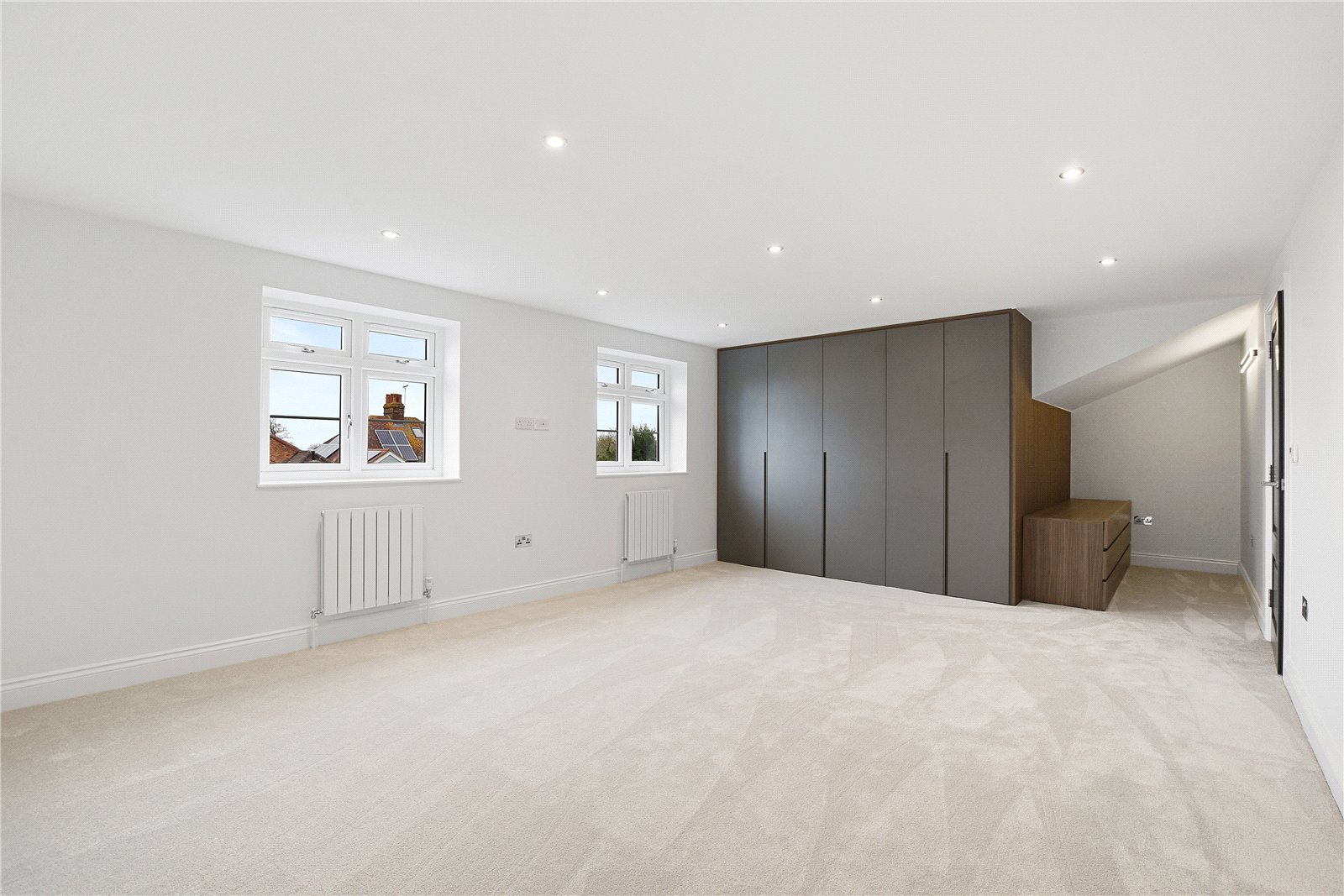 The principal bedroom is a true sanctuary, complete with an extensive range of floor-to-ceiling fitted wardrobes that span the length of the suite.