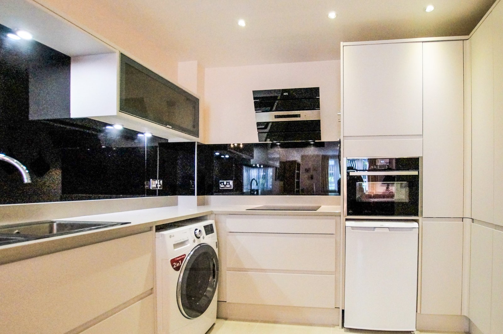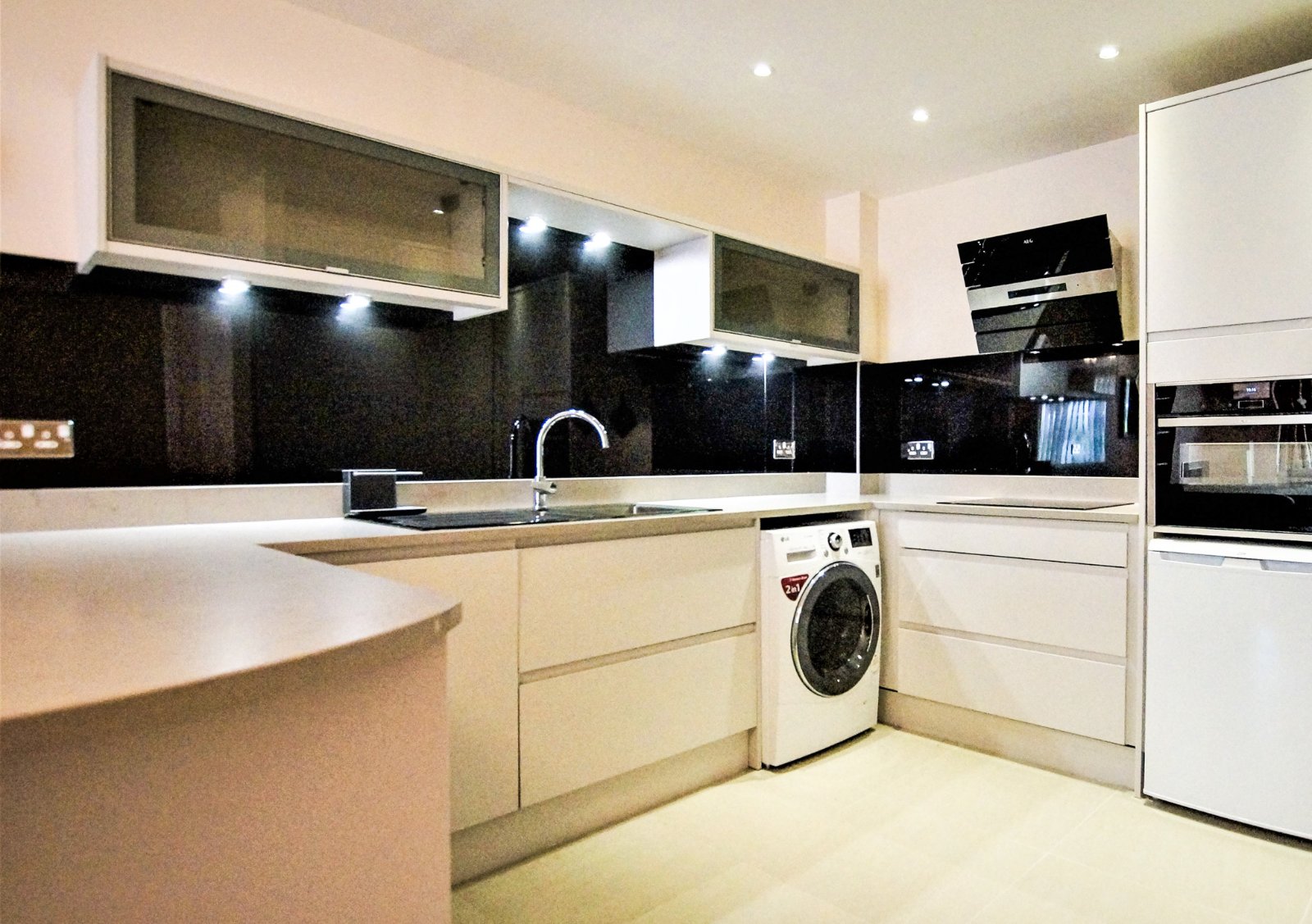 The property features a bright open-plan living area seamlessly connected to an extended, modern kitchen, finished with quality hard flooring throughout. The kitchen is fully equipped with an oven, hob, washing machine, dishwasher, large fridge and separate freezer, making it both practical and stylish.
