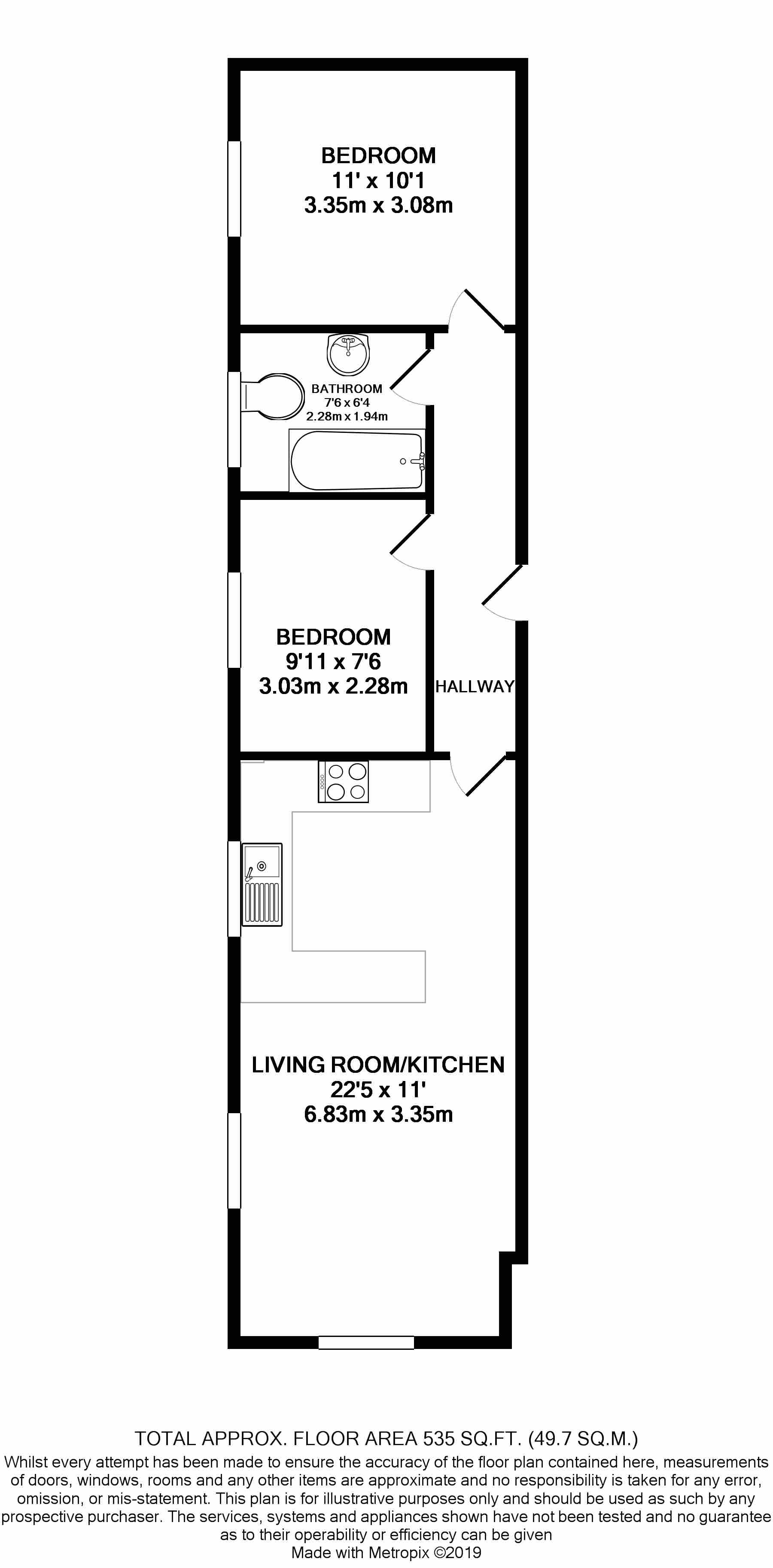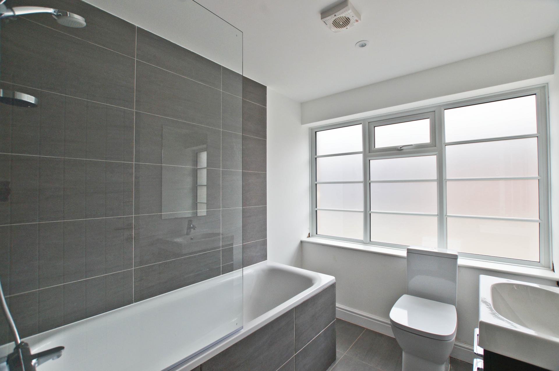 The accommodation comprises two bedrooms—one small double and one single—along with a sleek family bathroom featuring a bathtub and overhead shower.