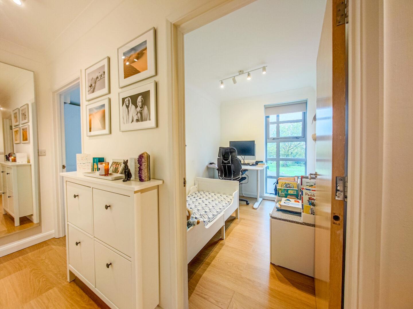 The principal bedroom is well designed and benefits from a contemporary en-suite shower room, along with fitted wardrobes and alcove shelving. The second bedroom is equally versatile, featuring a floor-to-ceiling window and offering flexibility as a guest room, home office, or child's bedroom.