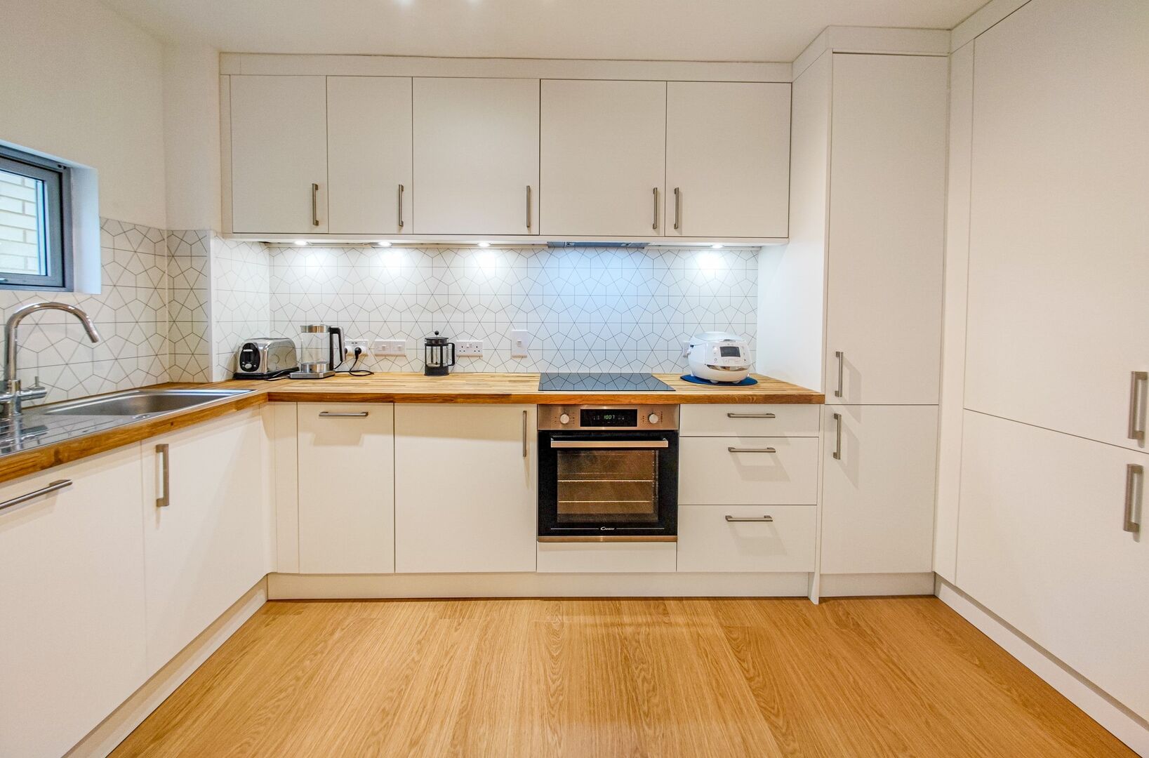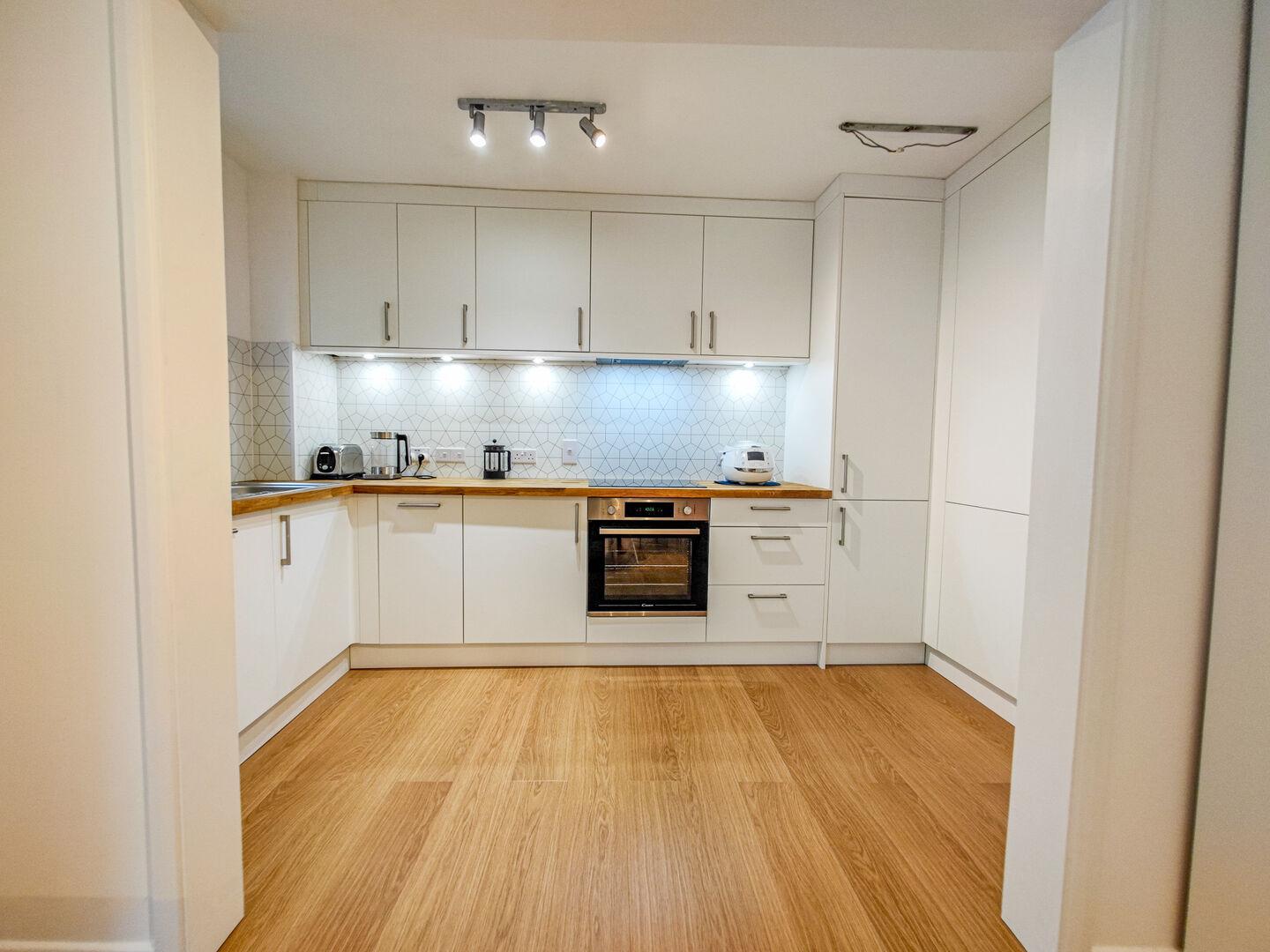 The semi-open plan kitchen is both stylish and practical, featuring newly fitted integrated appliances including a large fridge/freezer, dishwasher, and washer/dryer. Finished with attractive wooden worktops and a sleek, easy-to-maintain splashback, it offers excellent storage and functionality for everyday living.