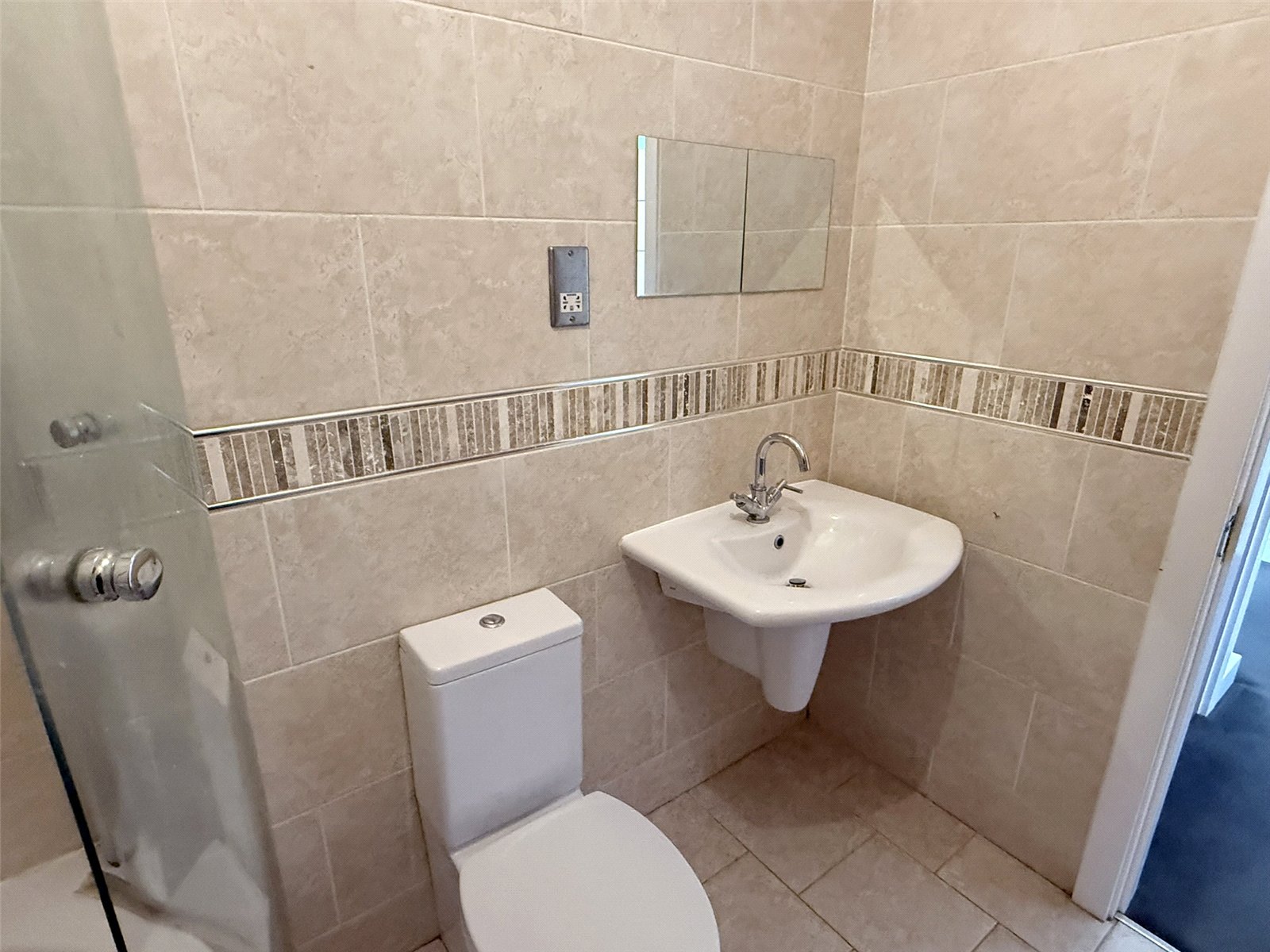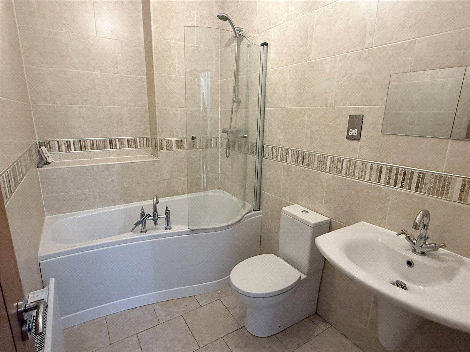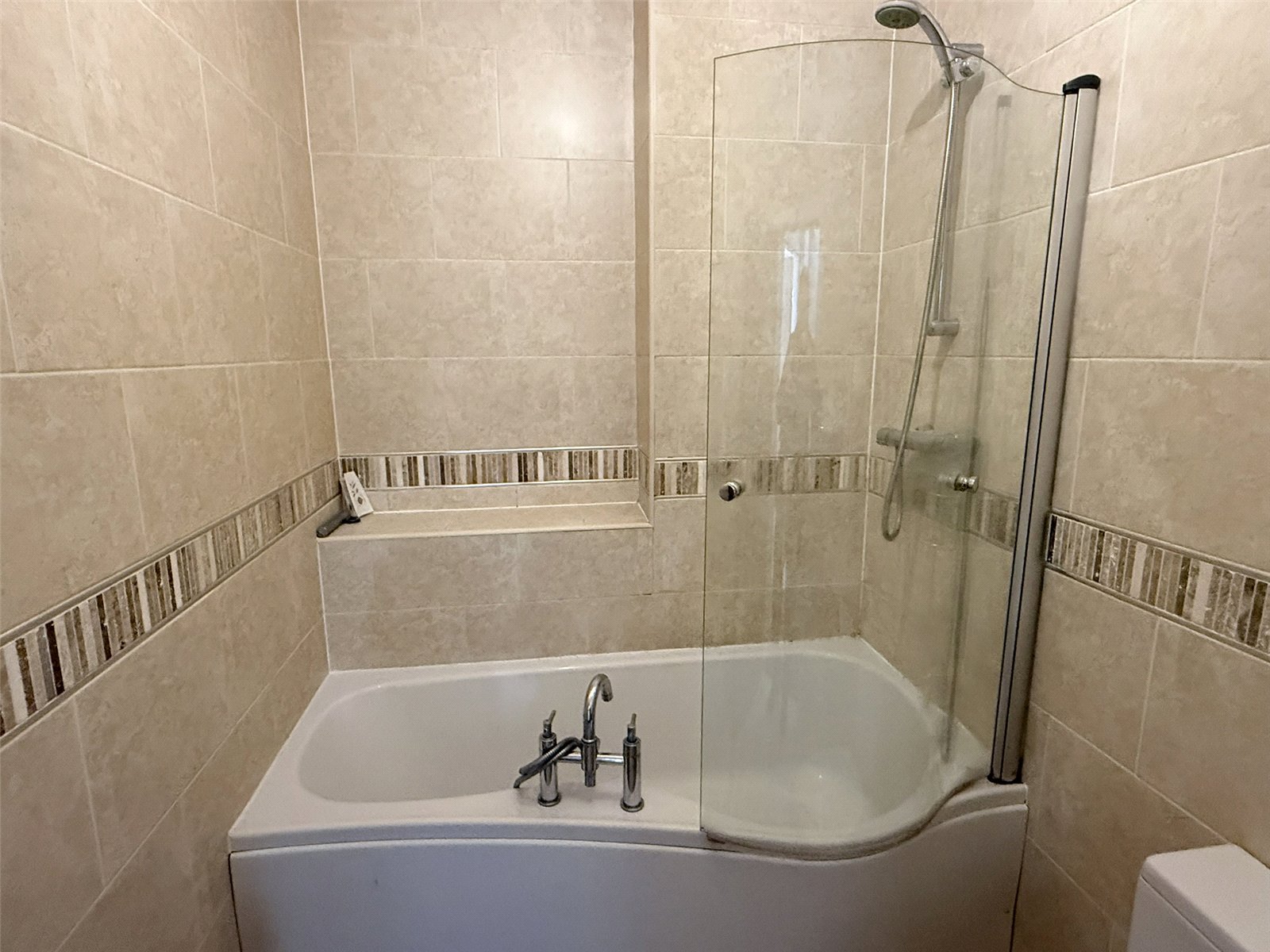 BATHROOM House Bathroom being fully tiled, white suite comprising; bath with shower over, low flush w.c, hand basin, chrome heated towel rail, extractor fan.