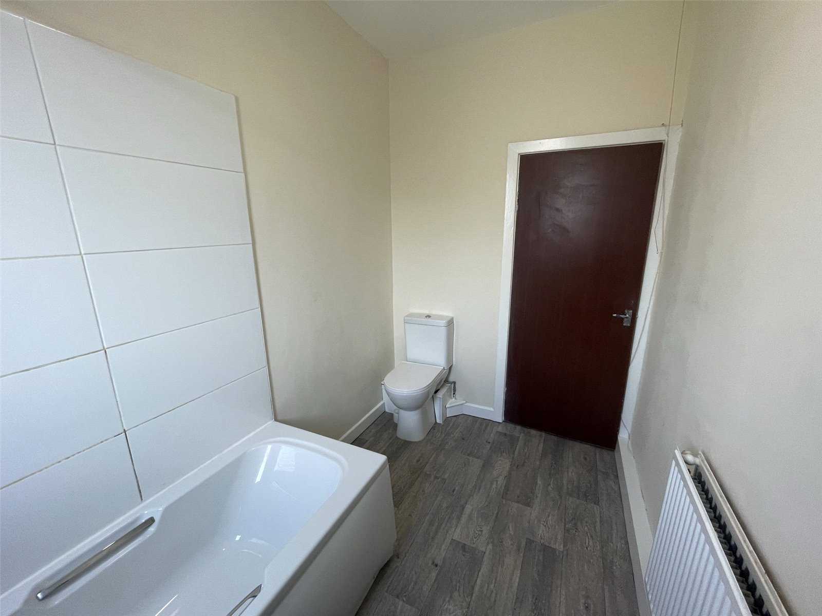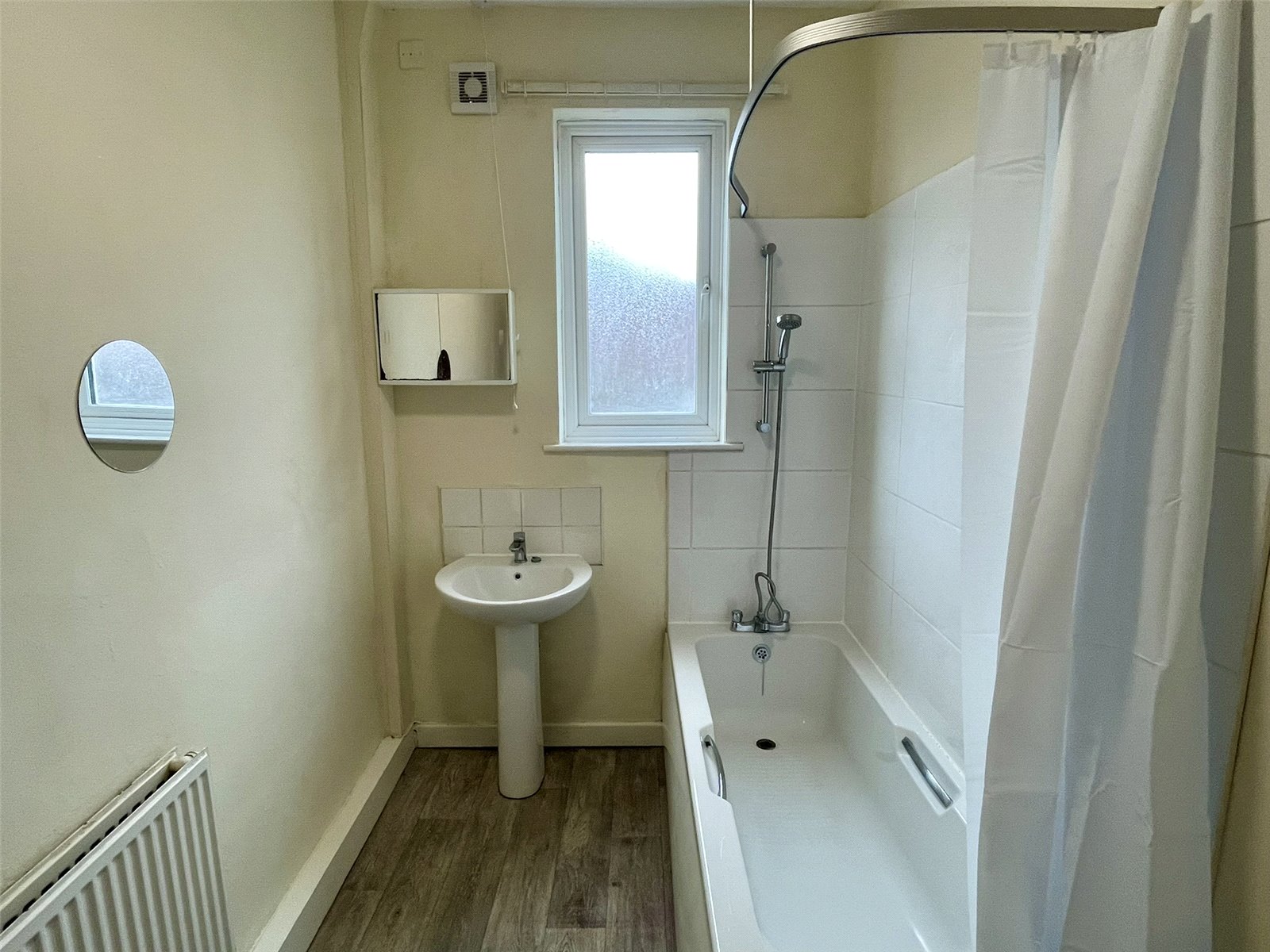 House Bathroom Fitted with white suite comprising low flush w.c, pedestal wash hand basin, bath with shower attachment, frosted double glazed window, extractor fan, central heating radiator.