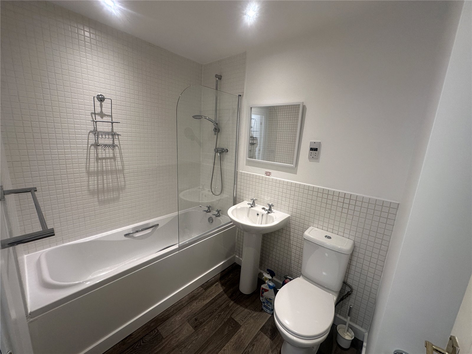 House Bathroom Fitted with a white suite comprising bath with shower over, pedestal hand basin with hot and cold tap, low flush W.C, part tiled walls, shaver point, extractor fan, radiator.