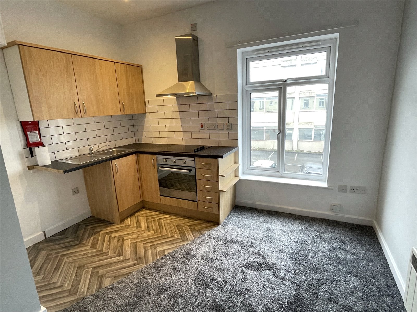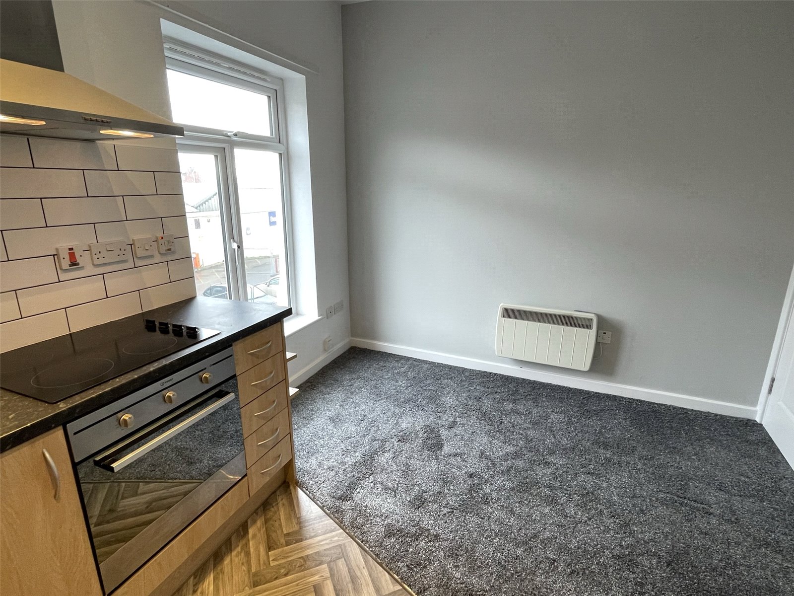 Lounge/Kitchen 11'7" (3.53m) (narrowing to 7'10" (2.39m)) x 9'10" (3.00m). Having two double glazed window making this a light and airy room, having open plan kitchen area with a range of modern wall and base units, space for washing machine and fridge freezer, integrated oven and sink.