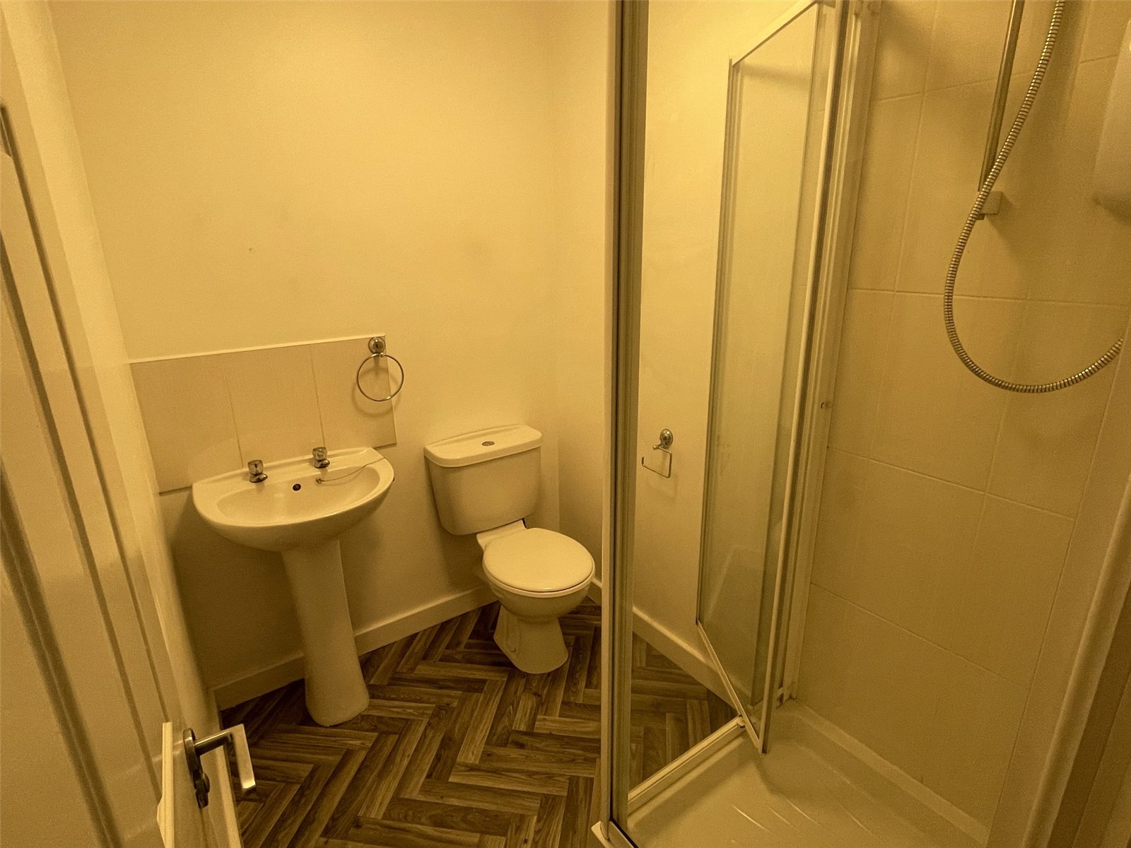 Shower Room Shower room fitted with a white suite comprising, low flush w.c, hand basin and walk in shower cubical with electric shower.