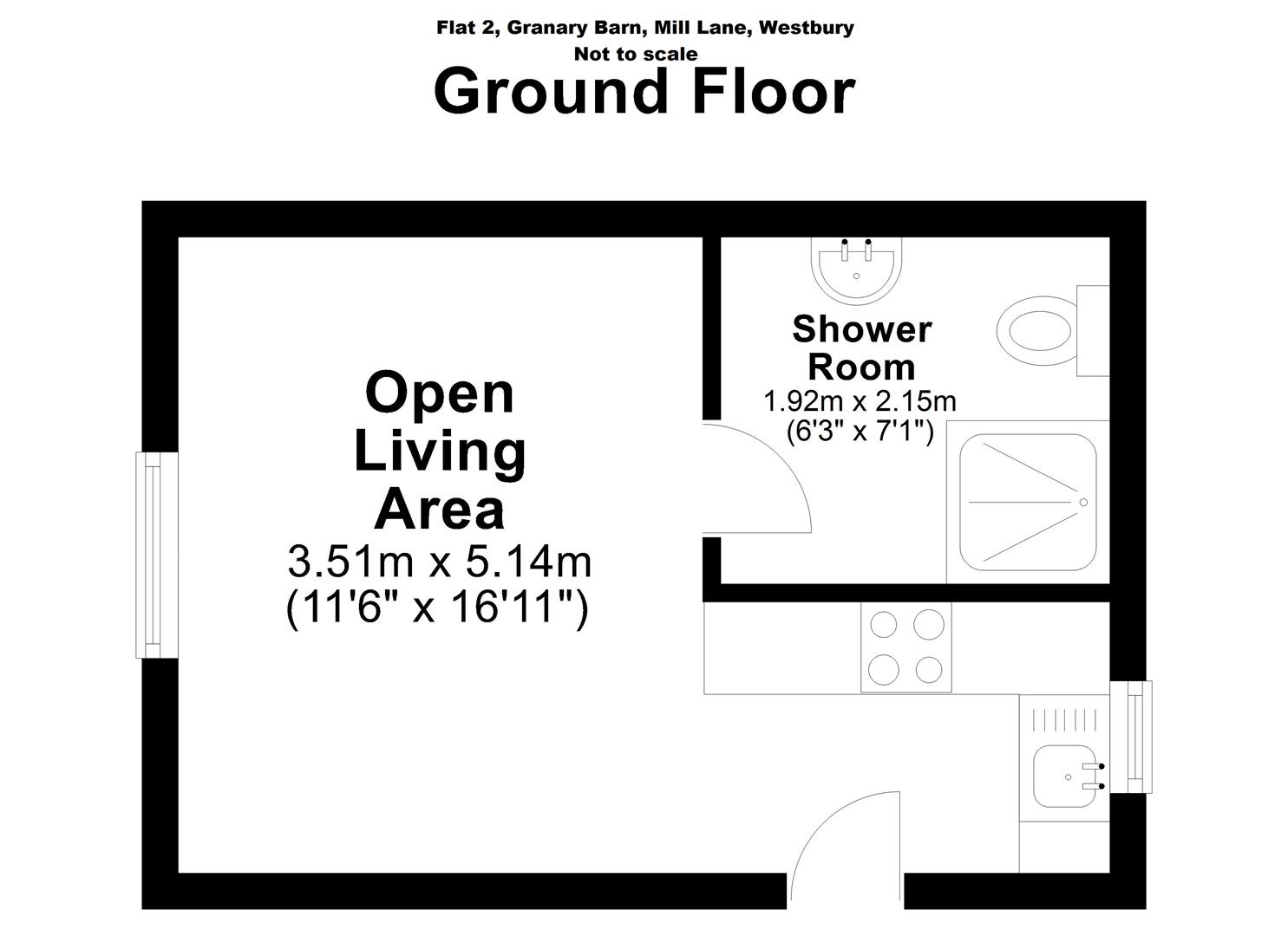 Open Living Area: - 5.176m x 3.511m narrowing to 2.436m - Windows to front, side and rear. Exposed ceiling beams. Living/sleeping area to front. T.V. Point. B.T. Point. Fitted kitchen to rear with wall and floor units incorporating sink unit, fridge, built in oven, hob, extractor and washing machine.