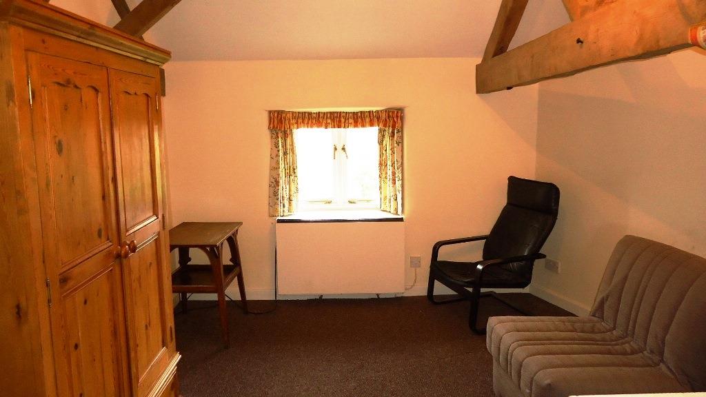 A first floor bedsit in a quiet village location. This property has irregular shaped accommodation comprised of a shared staircase with a storage cupboard, an open plan living area featuring exposed beams, a lounge/bedroom area to the front and a fitted kitchen area with appliances such as an oven, fridge, and a washing machine to the rear. and a shower room also exposed beams fitted with a low level WC, a wash hand basin and a shower cubicle. The property benefits from off-road parking.