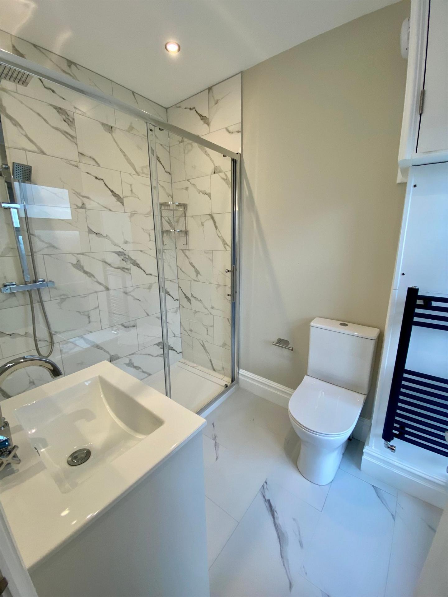 Having walk in shower cubicle, low flush w.c., vanity wash basin with cupboards under, part tiled walls, heated towel rail, double glazed window, cupboard housing gas fired central heating boiler.