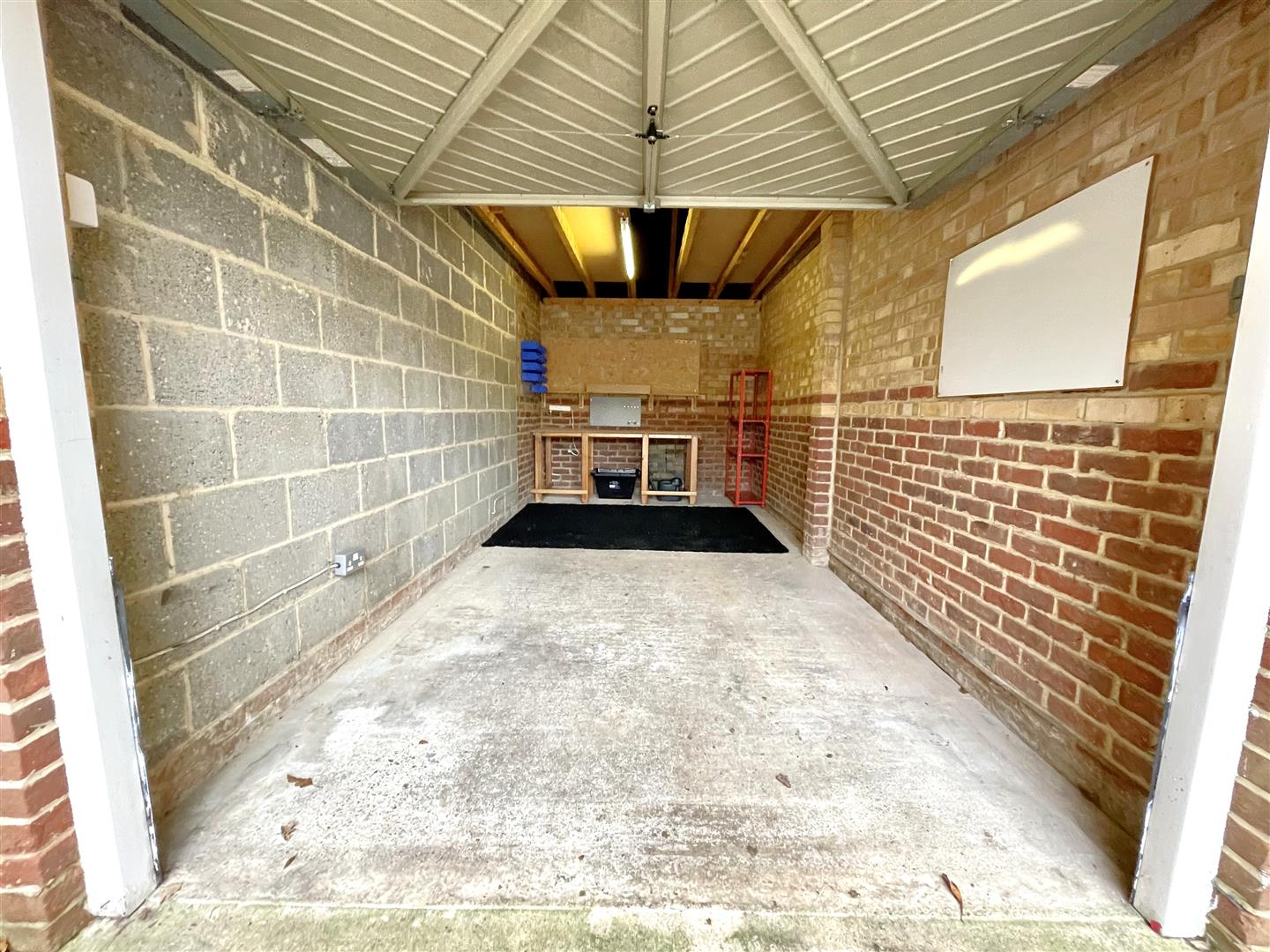 Garage with work bench and rack to remain & boarded loft space providing additional storage