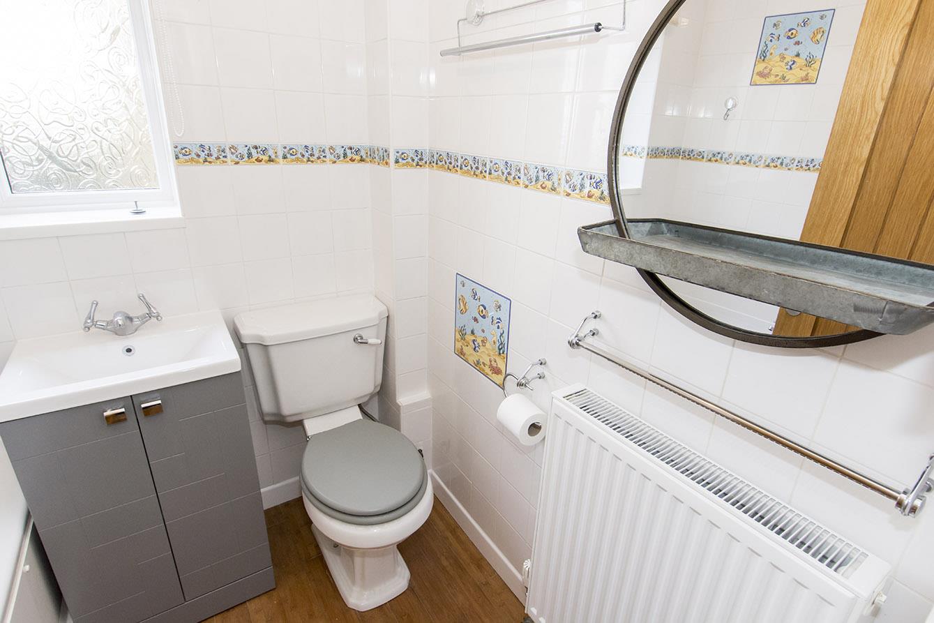 Bathroom - Panelled bath with electric shower fitment over. Wash hand basin. Low level wc. Complimentary tiling. Radiator. Wood laminate flooring. Extractor fan. Opaque double-glazed window.