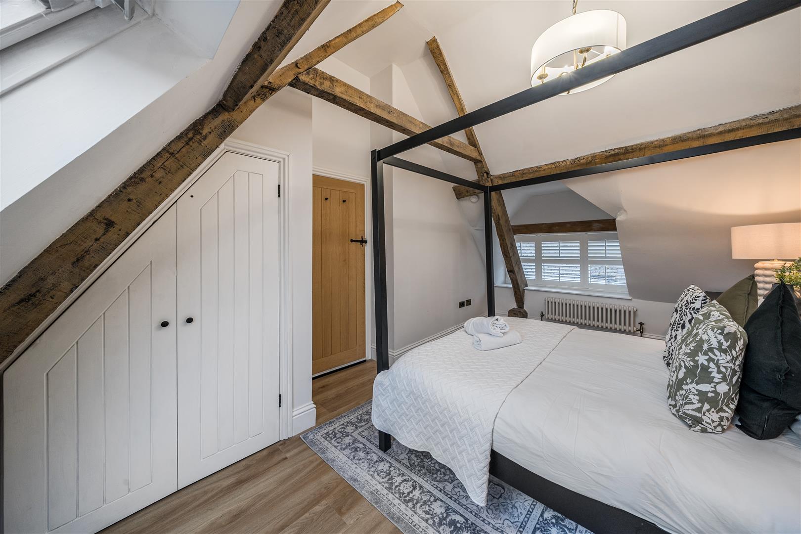 The first floor features two beautifully decorated double bedrooms, one with an exposed brick wall, and a stylish family bathroom. The second floor is dedicated to the master bedroom with en-suite, a stunning space showcasing traditional Cotswold features including wooden beams and slanted ceilings. Multiple windows fill the room with light, and built-in storage adds practicality.