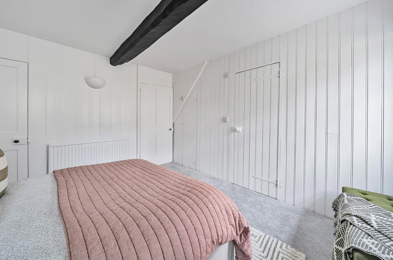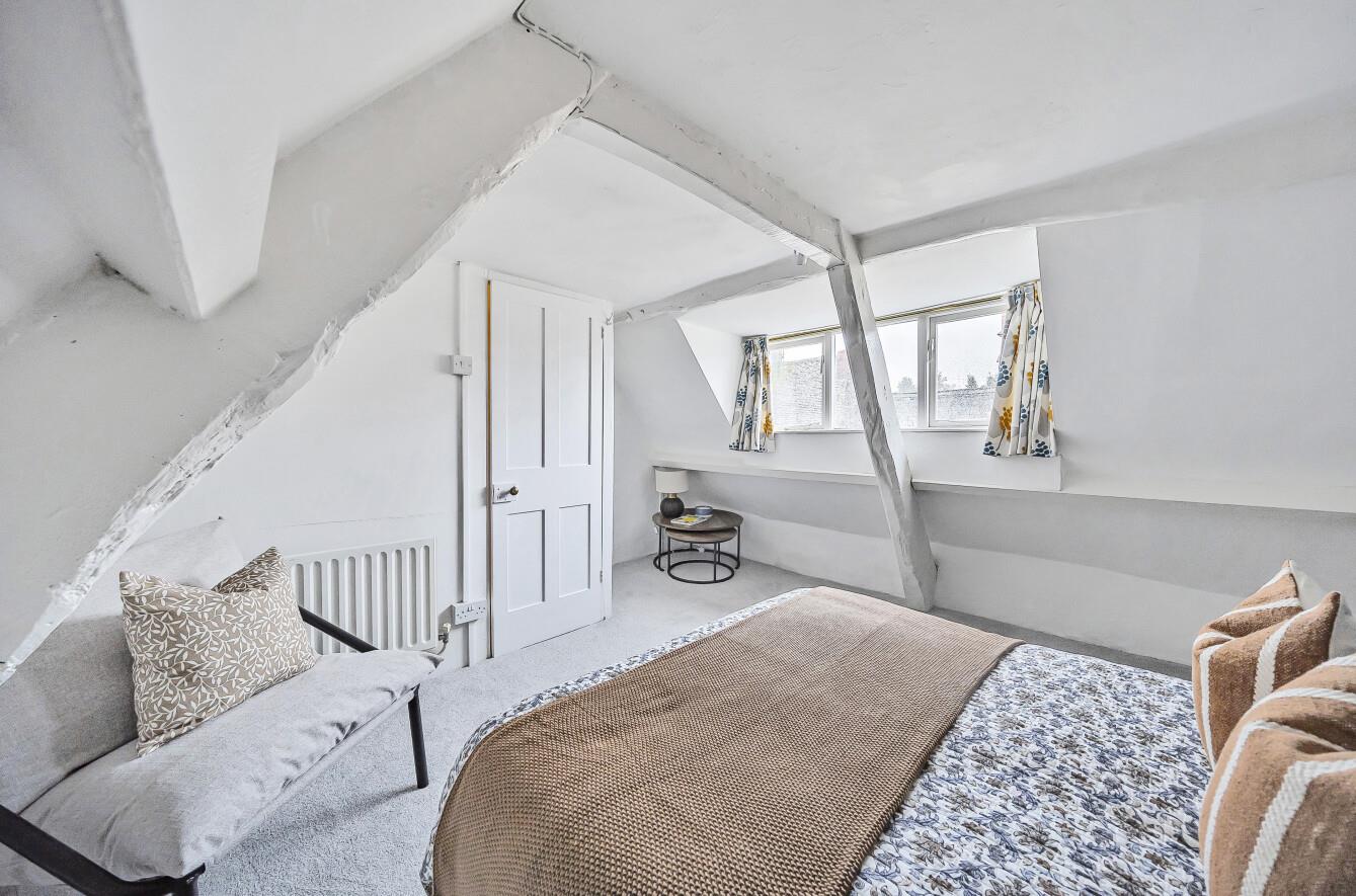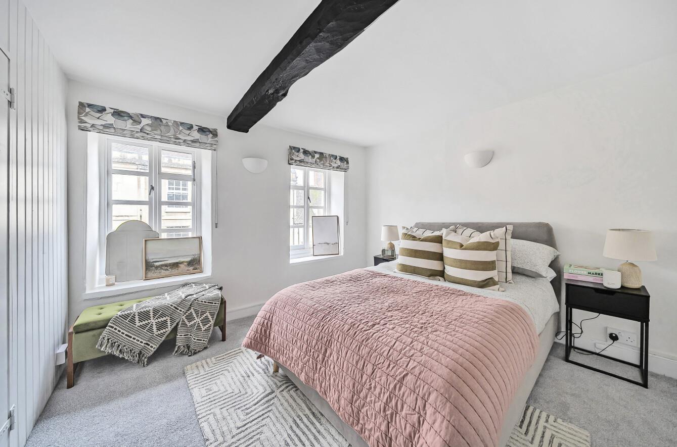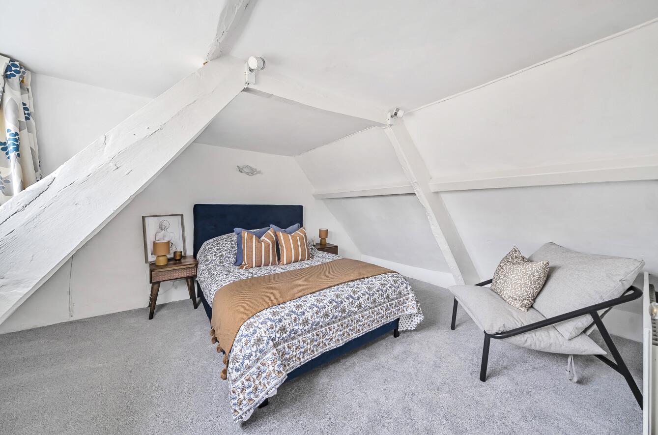 Upstairs, the first-floor hosts a spacious double bedroom, with a en-suite shower room and two large bay windows, allowing the light to flood in. The second double bedroom occupies the top floor, with beautiful beams and windows with lovely views over the town.
