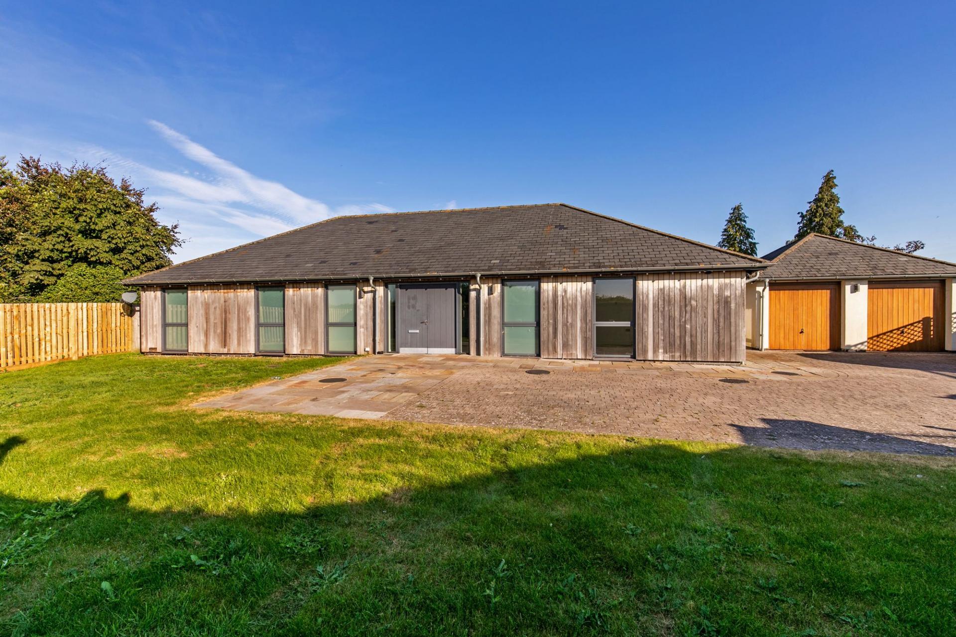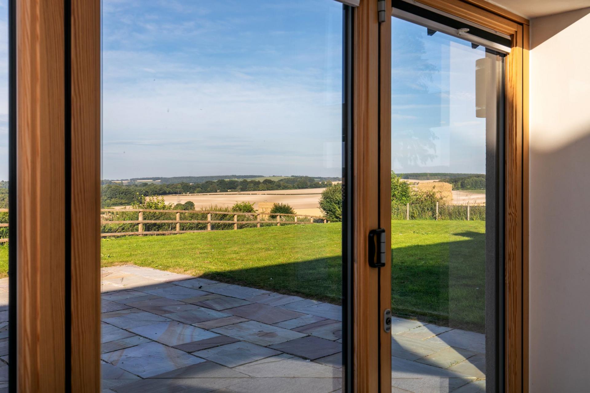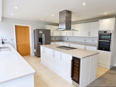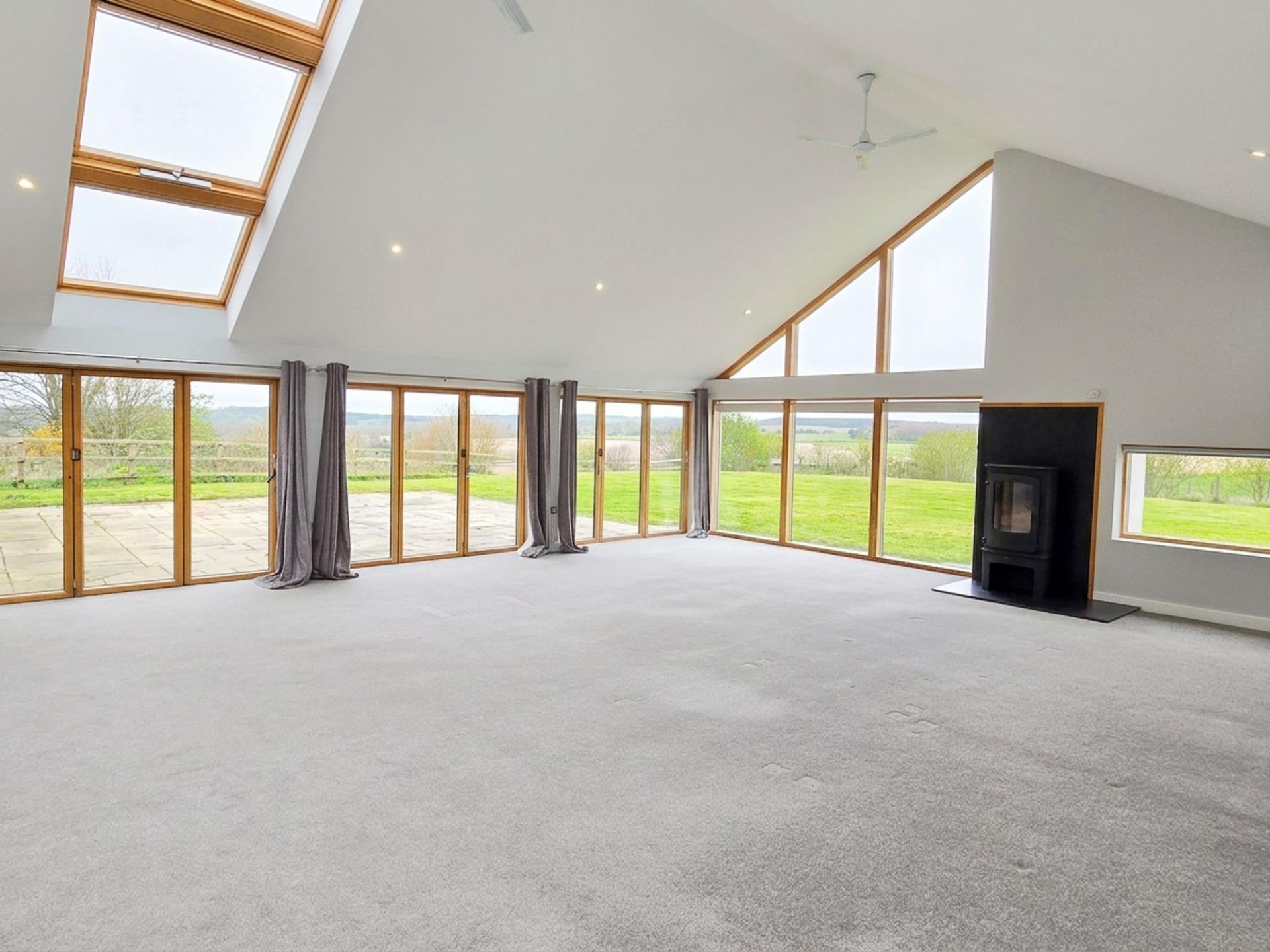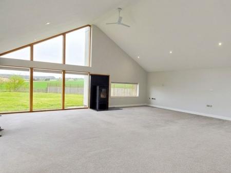 Double doors lead into the welcoming reception hall, which in turn leads to the main feature of this unique home - the beautiful open plan living / dining area complete with modern fireplace and a wall of bi-fold doors. These, combined with large windows throughout, provide a light and airy feel with stunning countryside views. The stylish fitted kitchen flows from the living area and includes an oven, hob, dishwasher, wine fridge while a separate utility room houses the washing machine and has a side door entrance. The large principal bedroom comes with an en-suite bathroom, while bedroom 2 enjoys a luxurious en-suite wet room with twin showers. Bedrooms 3 and 4 are serviced by a family bathroom. Outside the patio area provides ideal space for entertaining, whilst taking in the beautiful views across the extensive lawned garden.