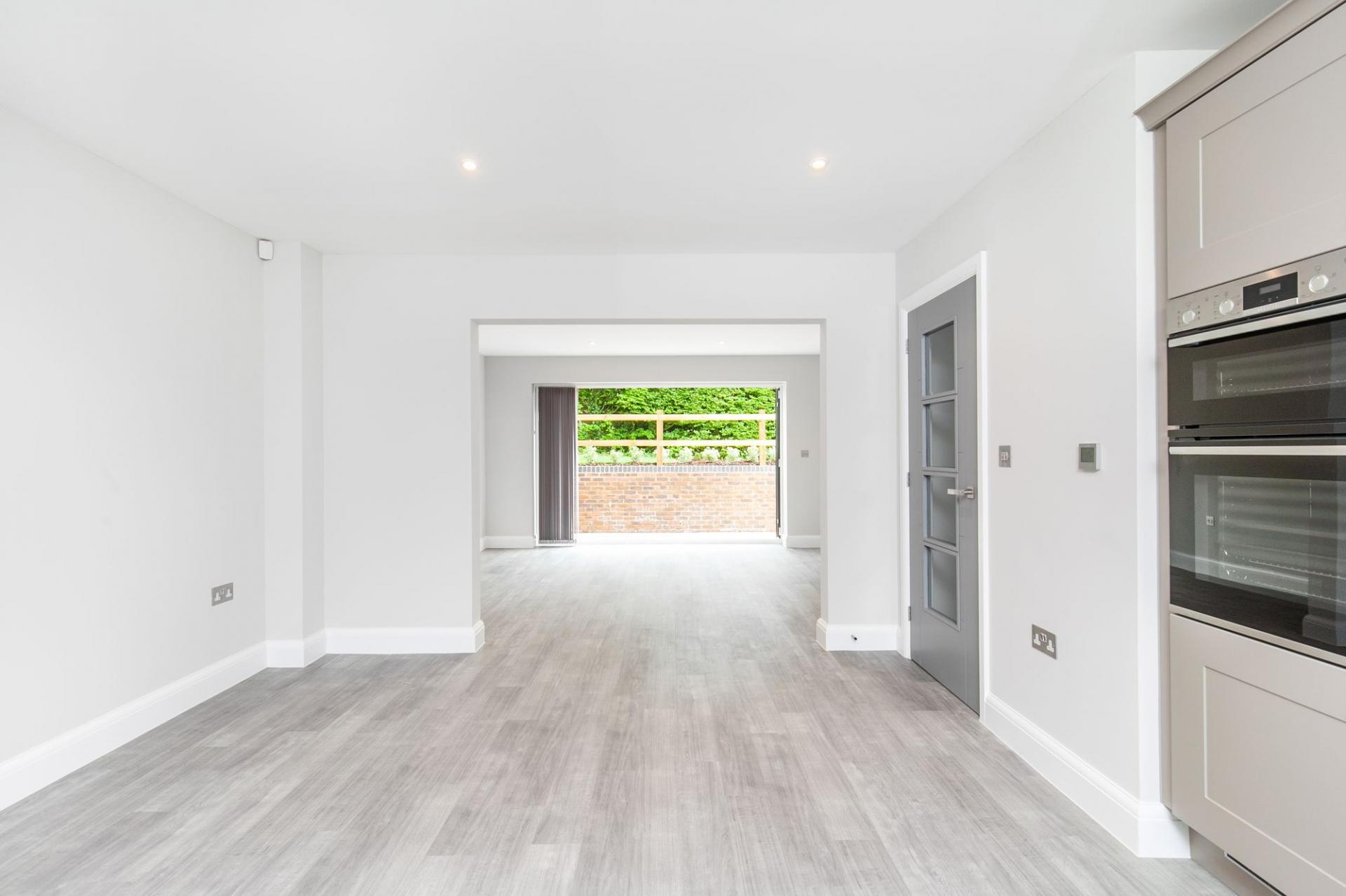 The open plan ground floor kitchen/living/dining room offers a truly fantastic, convivial reception space; it has Karndean flooring throughout and bi-fold doors open out onto the rear garden. The kitchen itself is supplied by Controlled Interior' and comprises traditional painted units with chrome door furniture and integral appliances including a hob, oven, fridge freezer, washing machine and dishwasher. There is a ground floor cloakroom and a useful storage cupboard. Upstairs an extensive range of storage cupboards provide practicality on the landing and both double bedrooms have built-in wardrobes; the principal has en-suite shower room and there is also a family bathroom.