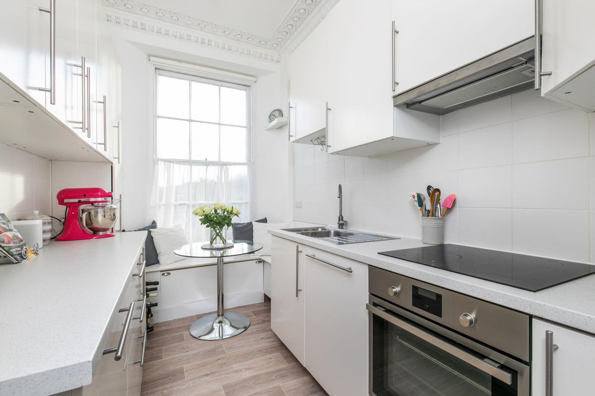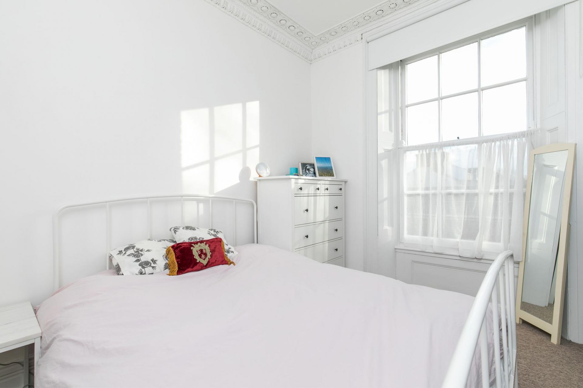 In the sitting/dining room is an attractive ornate original fireplace and one large rear aspect sash window with traditional folding shutters. The kitchen/breakfast room has one front aspect sash window and is fitted with a range of wall and base units, fitted window seat, integrated electric oven, hob, integrated microwave , integrated fridge, integrated freezer and integrated dishwasher. A light and bright double bedroom has one front aspect sash window and an original ornate fireplace.